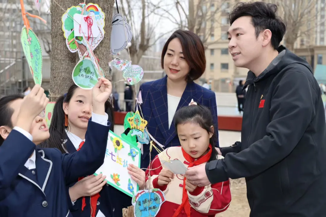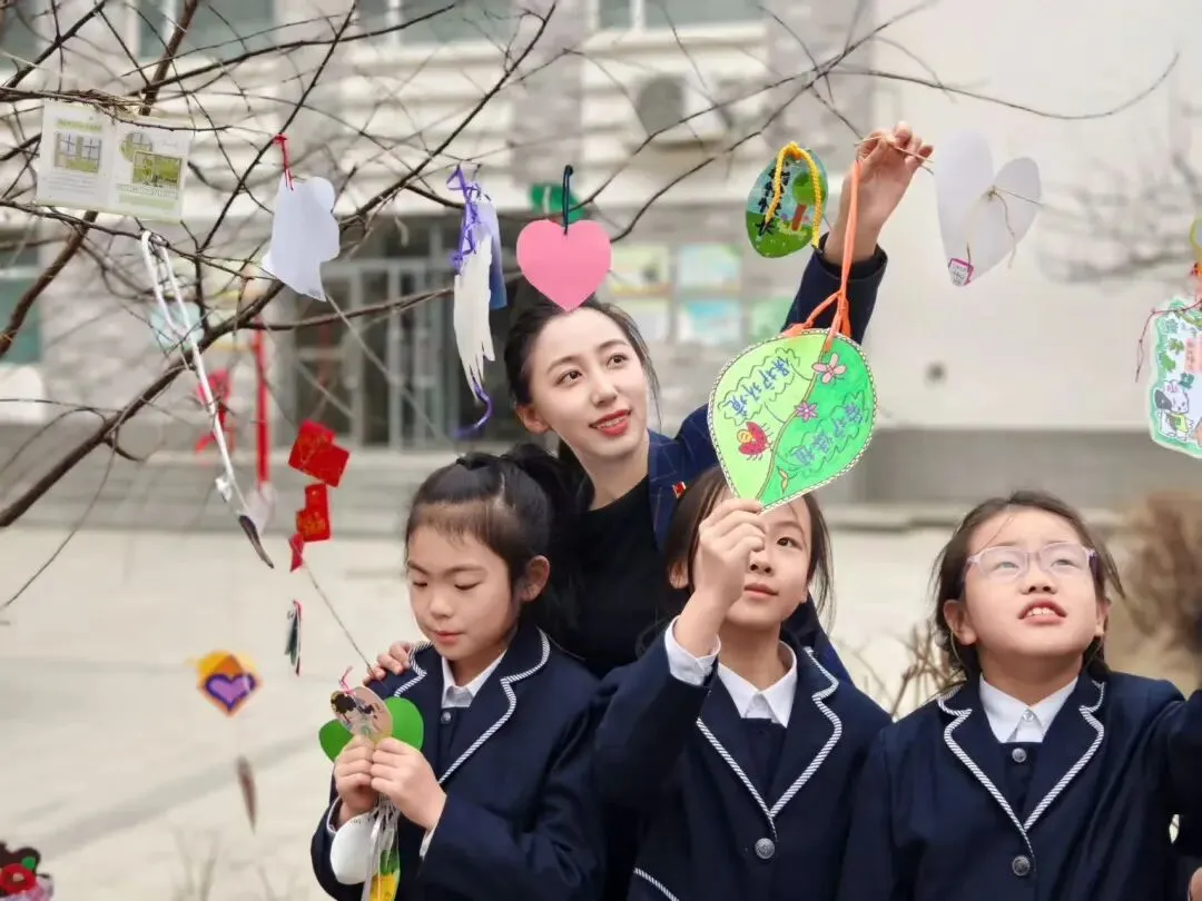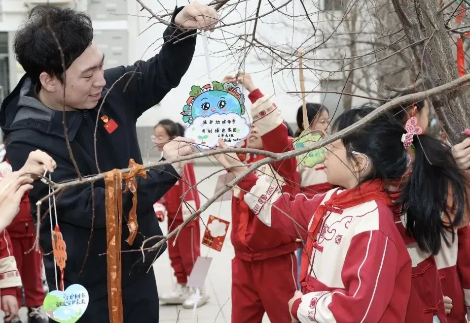 宣讲结束后,宋世辉老师与孩子们一同来到户外,共同参与“我与小树共成长”心愿卡悬挂活动。孩子们亲手制作的精美心愿卡挂满枝头,一句句纯真的心愿、一个个美好的期盼,在春风中与小树一同生长,成为校园里最温暖的风景。
