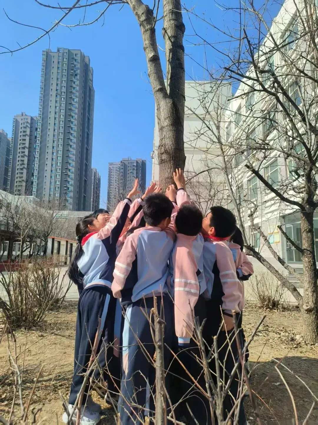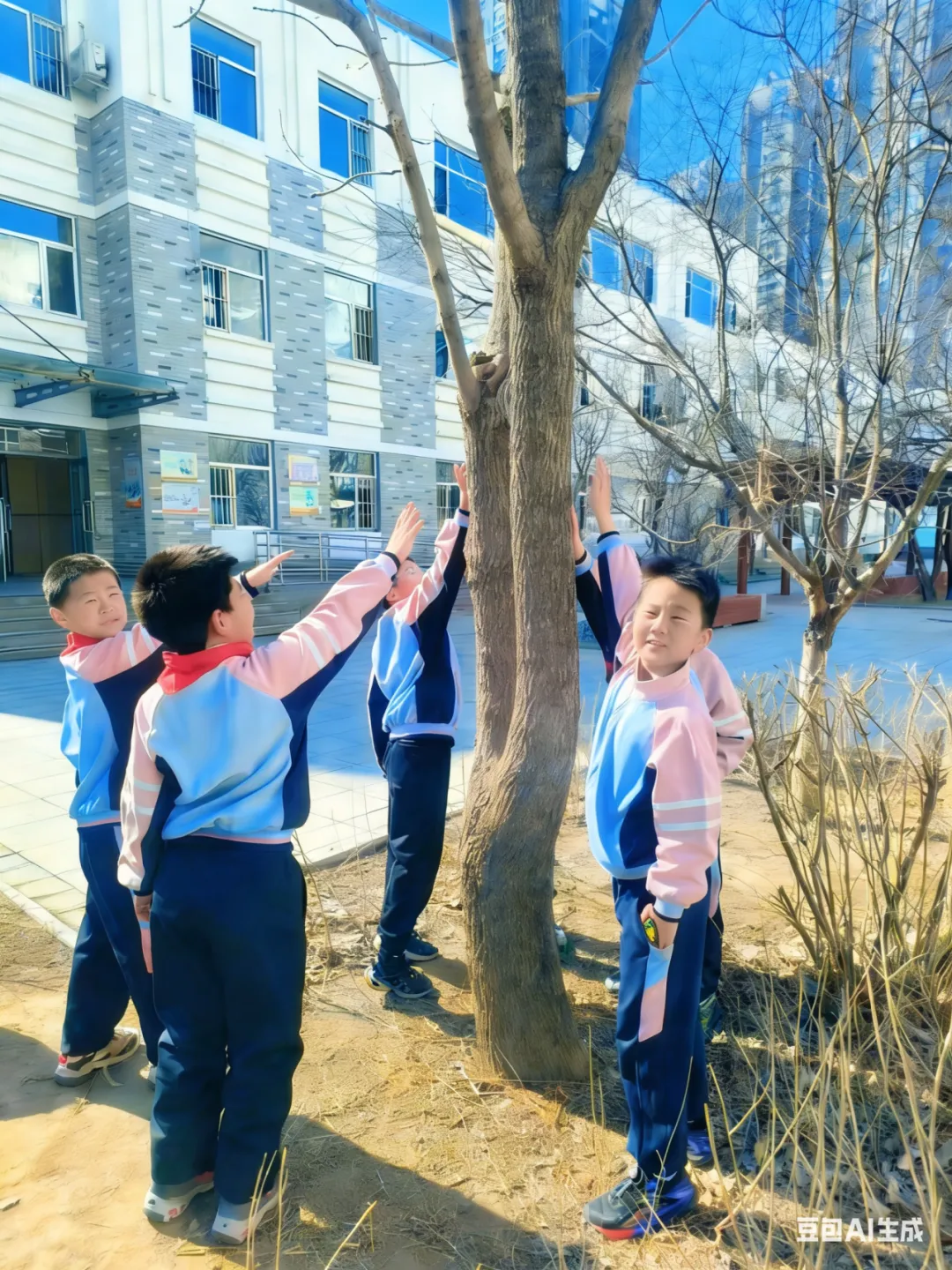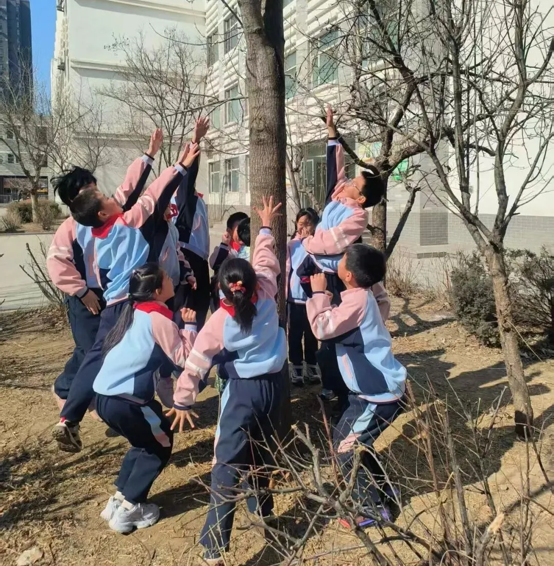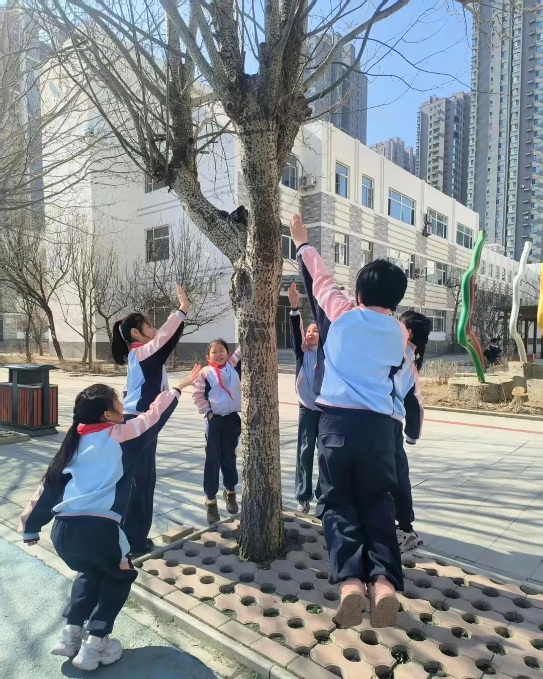 学校精心设计“我与小树比身高”趣味体育活动,孩子们在阳光下与小树比一比、跳一跳、量一量,在轻松愉快的互动中舒展身体、锻炼体能。