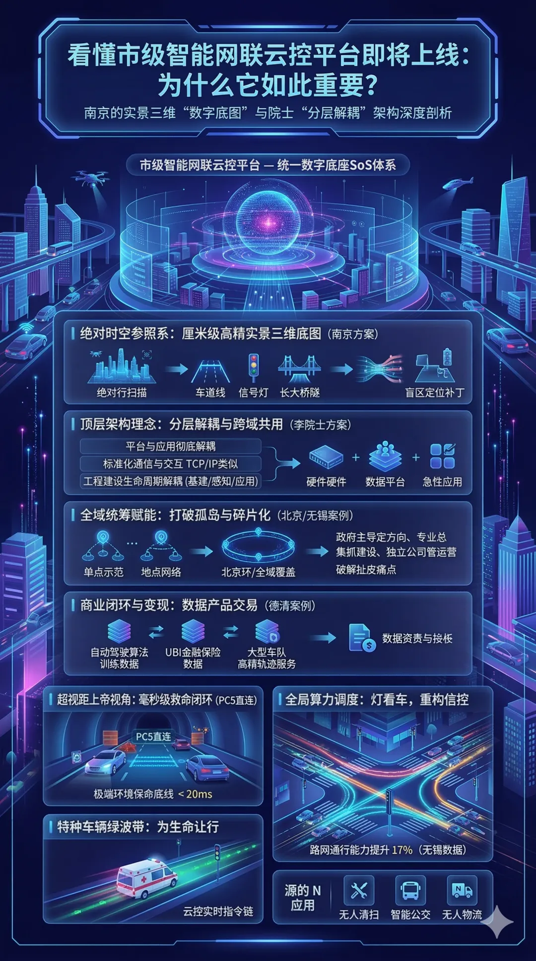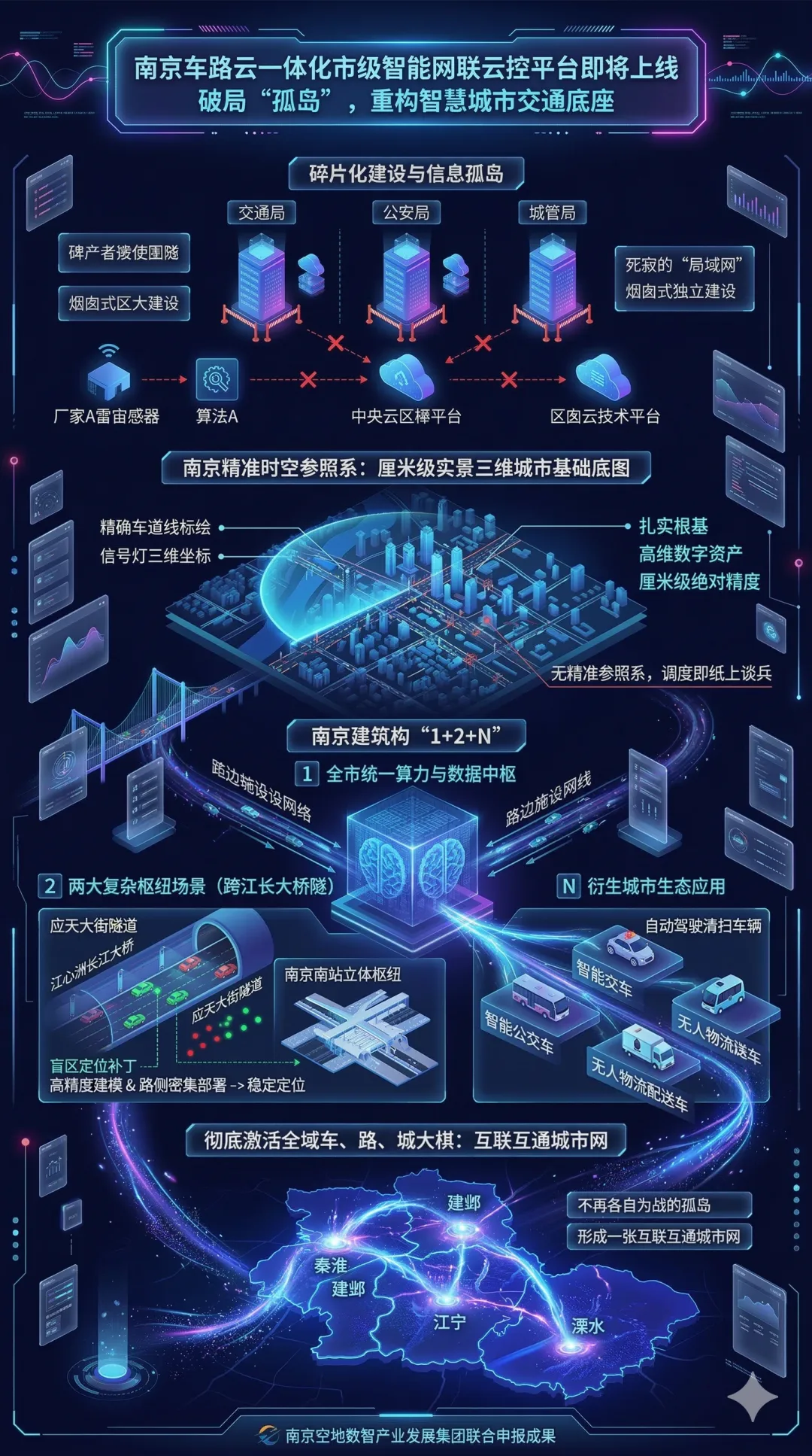 昨天,从南京交通部门获悉,由南京市规划和自然资源局牵头,与该市交通集团所属空地数智产业发展集团等单位联合申报的《基于实景三维南京构建智能网联汽车云控平台基础底图》,于近日成功入选2025年实景三维江苏创新应用典型案例。在该成果支持下,南京的“车路云一体化”市级智能网联云控平台即将上线。今天,我想结合南京等地极具代表性的市级平台建设方案,一起看一下,一个真正意义上的“市级云控平台”为什么如此重要?它又是如何通过底层的重构,彻底激活车、路、城这盘大棋的。