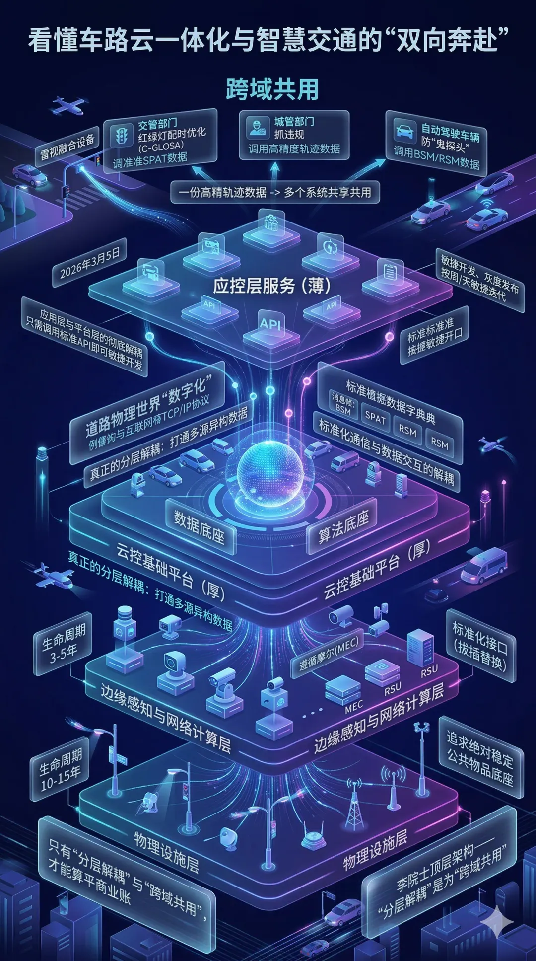 - 边缘感知层: 雷达、RSU、MEC节点,生命周期3-5年,遵循摩尔定律,随时可以通过标准化接口“拔插替换”,不依赖特定算法厂家。