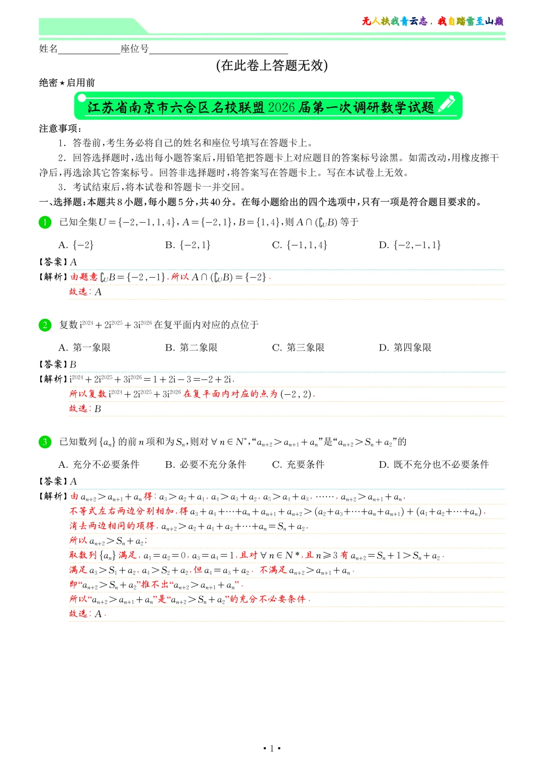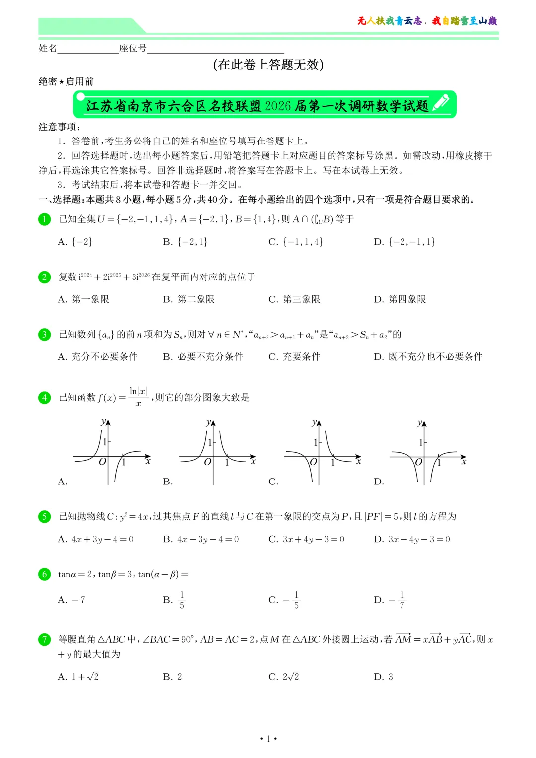 >江苏省南京市六合区名校联盟2026届第一次调研数学试卷和答案