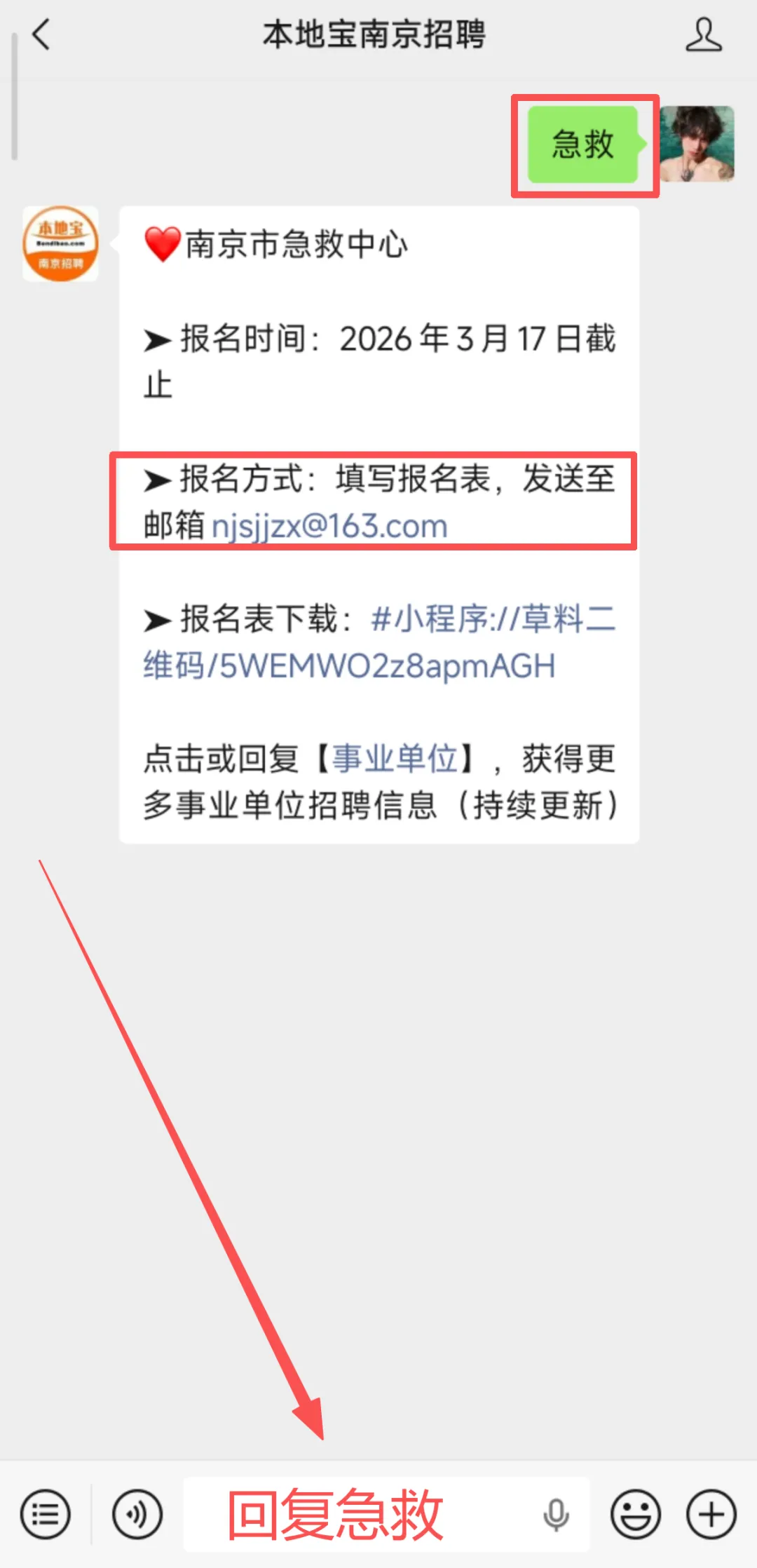 报名方式:您可以长按下方二维码,关注【本地宝南京招聘】公众号,回复【急救】,即可直达报名入口!