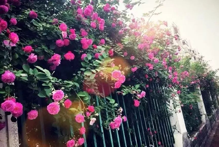 四五月份的南航,是被蔷薇花承包的浪漫天地。繁茂的碧叶间,一朵朵蔷薇花肆意绽放,明媚又张扬,层层叠叠的花瓣攀附在小北门的栅栏上,形成绝美的花墙景观。