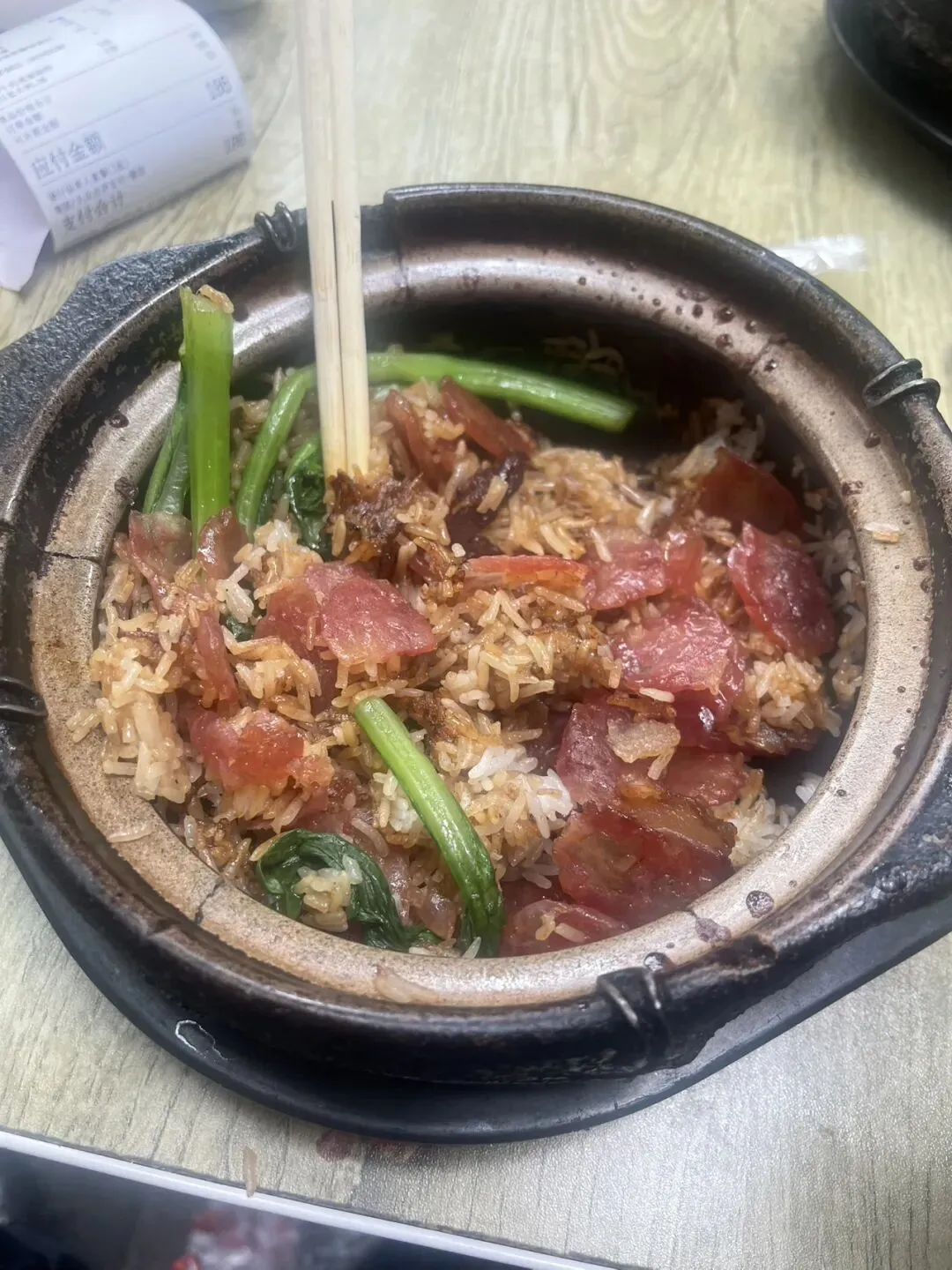 等了大概十几分钟,砂锅“滋滋”响着端上来,那香味儿直接就把隔壁桌的视线给吸引过来了。打开盖子,热气腾腾,腊肠的油润、排骨的肉香,混合着米饭的香气,直往鼻子里钻。