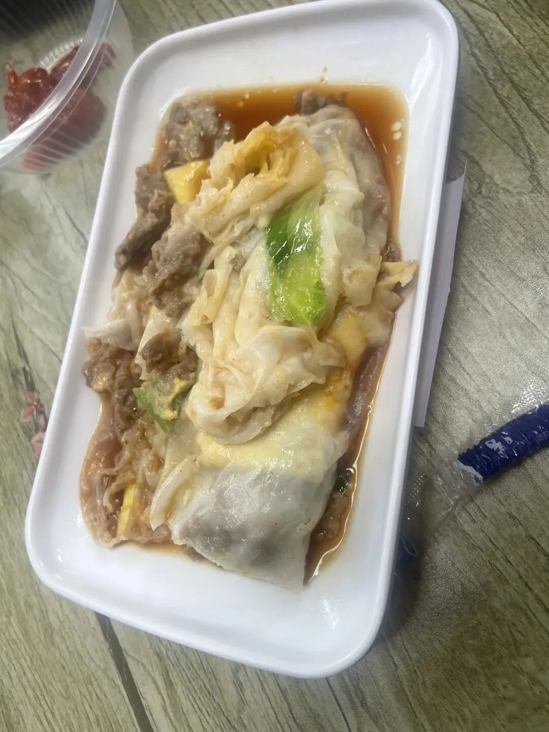 最关键是那个酱汁,咸淡适中,鲜味儿足,淋在肠粉上,每一口都裹满了酱香,吃起来特别满足。确实跟我在广州吃过的那些老店味道差不多,没有那种乱七八糟的添加剂味儿,就是纯粹的米香和酱香。