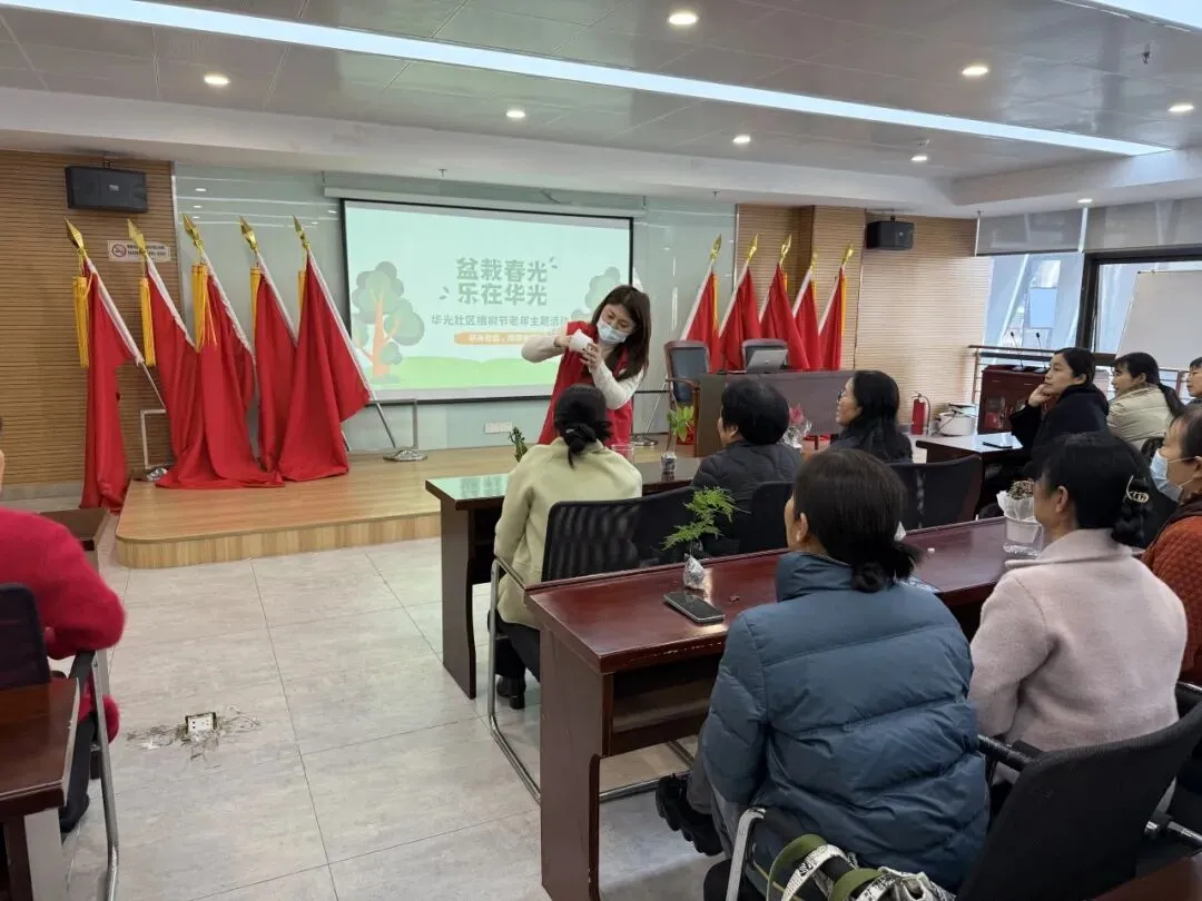 春风催新绿,巧手种春光。3月12日上午,华光社区居家养老服务中心内欢声笑语、绿意盎然,一场以“盆栽春光・乐在华光”为主题的植树节老年绿植DIY活动温馨举行。辖区20位老年朋友欢聚一堂,亲手挑选心仪的绿植,栽种属于自己的春日风景。