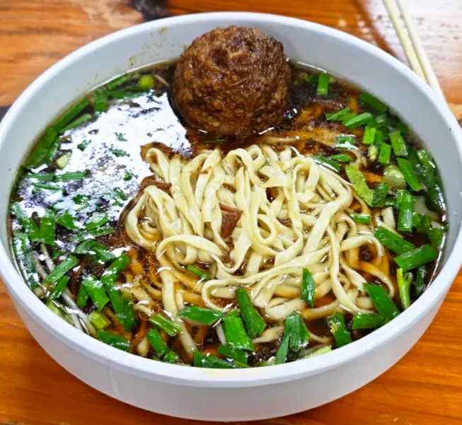 重点说说这锅盖面。做法挺有意思:大锅煮面,水里漂着个小木锅盖。不是为了好看,而是为了压住浪头,让面条在水里透气又不散乱。面条是那种“跳面”,师傅坐在竹竿上压出来的,煮出来劲道,咬断时甚至能感觉到一点点回弹。汤底是酱油和十几种佐料熬的,黑亮黑亮的,看着咸,喝着却鲜,一碗下肚,额头微微冒汗,人就通透了。