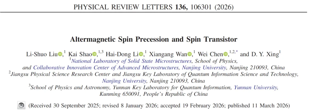 Li-Shuo Liu et al., Altermagnetic Spin Precession and Spin Transistor, Phys. Rev. Lett. 136, 1063301 (2026).