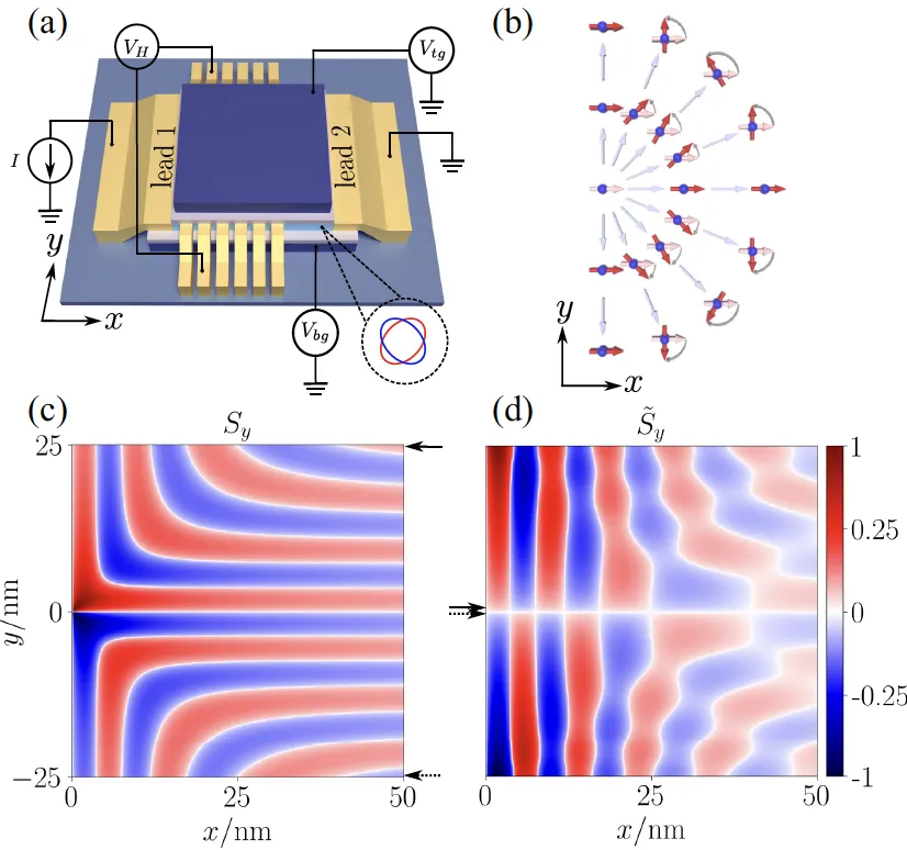 针对这一问题,研究团队提出并研究了一种基于二维d波交错磁体的多端量子输运器件模型。研究发现,当具有特定自旋极化的电子注入交错磁体后,会在实空间中产生独特的自旋进动现象,从而形成周期性的自旋纹理结构。这种自旋进动源于动量空间中的交错磁自旋分裂,并能够在器件中表现为横向类霍尔电压的空间振荡。进一步分析表明,这种电压振荡的周期与交错磁自旋分裂强度之间存在明确的解析关系,因此可以作为识别交错磁体的重要“指纹信号”。此外,该物理效应对退相干和晶体能带畸变具有良好的稳定性。当交错磁序能够通过电场调控时,该器件结构还可以自然演化为一种高效率自旋晶体管原型。这一研究不仅为探测交错磁体提供了新的实验方案,也为将其应用于下一代低功耗自旋电子器件奠定了理论基础。