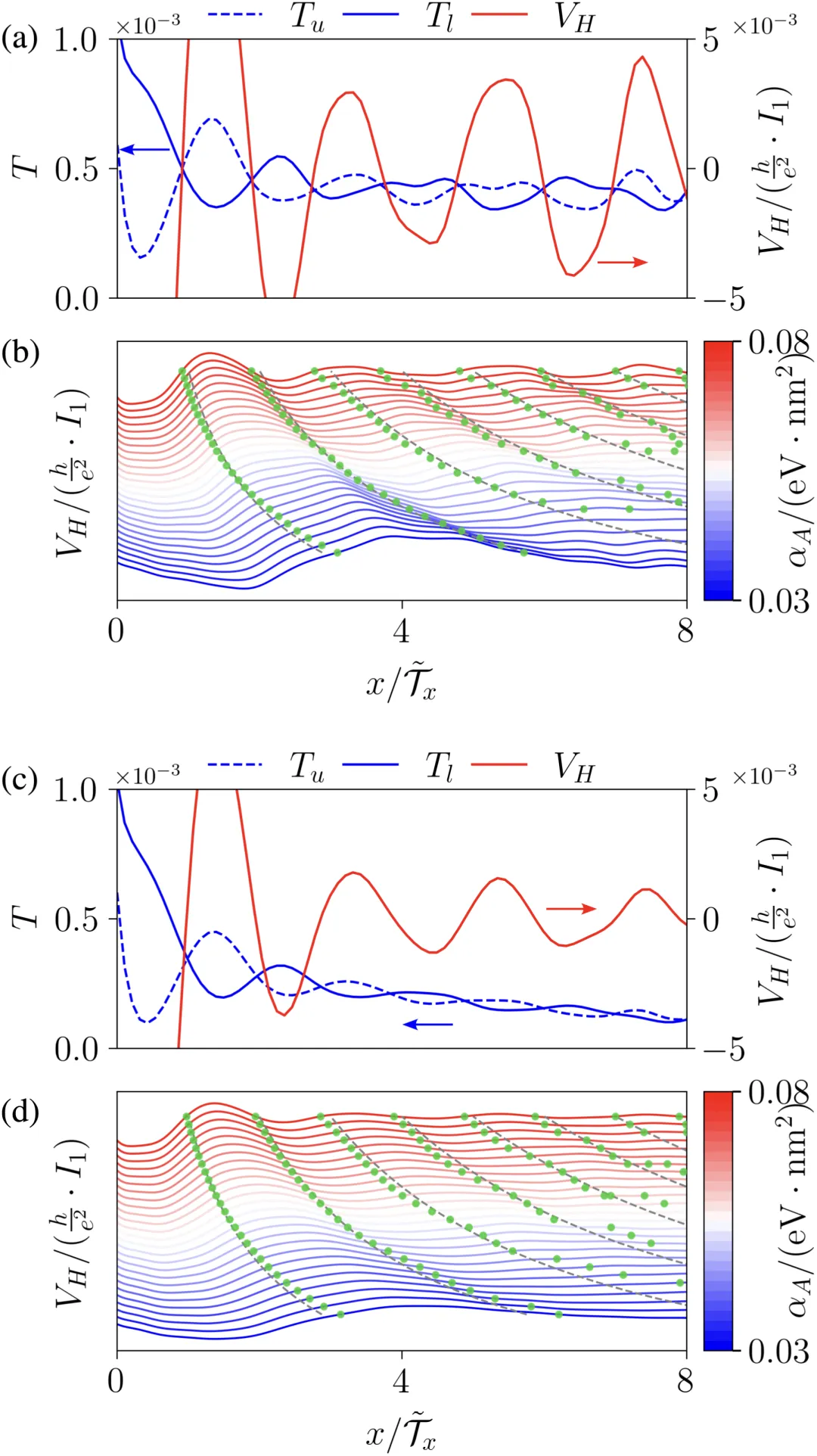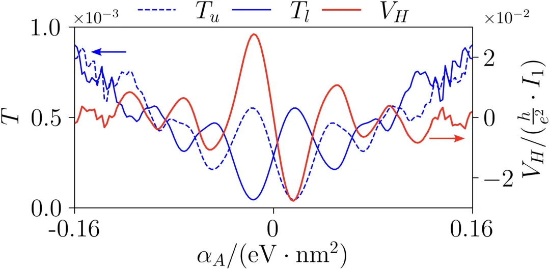 图2:(a) 在αA = 0.08 eV·nm² 条件下,从引线1到上探针(蓝色虚线)和下探针(蓝色实线)的透射概率以及霍尔电压(红色实线)随 x 的变化关系。(b) 不同交变磁劈裂αA下,霍尔电压随x变化的瀑布图,其零点用绿点标出。(c),(d) 包含 Γv = 3 meV退相干效应的相同图示。散射区域尺寸为50 nm×50 nm,晶格常数 a = 0.5 nm。引线1和2的界面跳跃参数设为t,横向引线的界面跳跃参数设为 0.1t。所有其他参数与图1相同,对应于空间周期韦4.67 nm。图3:在x=12.5 nm处,透射概率和霍尔电压随αA的变化关系。所有其他参数与图1相同。