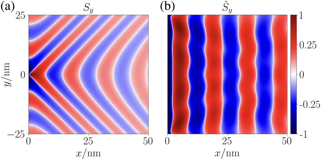 图4:非平衡传播电子在(a)点注入和(b)线注入下的自旋分量空间分布,注入自旋沿x方向极化。为增强零值附近的对比度,色标应用了平方根尺度。所有其他参数与图1相同。