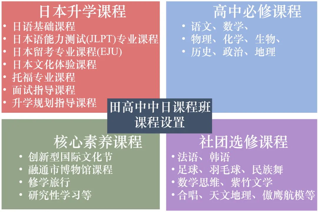 国际部与年级部同出入、同作息;课程建设上,以“立德树人”“五全育人”为指针,拥有成熟的优质课程体系,加上16年来积累的升入日本顶尖名校的丰富经验,培养的学生素质全面,田高中是省、市、区官方首选青少年日本交流学校。国际部学生既参加专业的日语升学课程学习,也参加高中必修课程、核心素养课程以及社团选修课程。