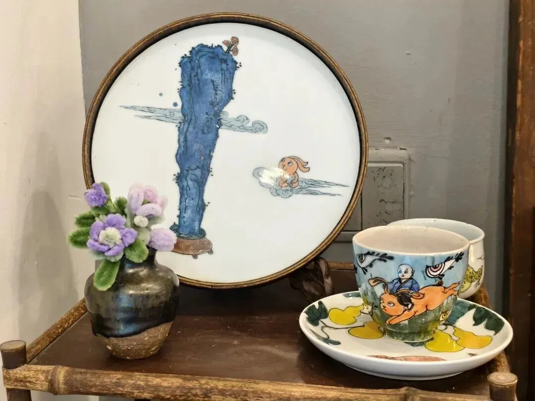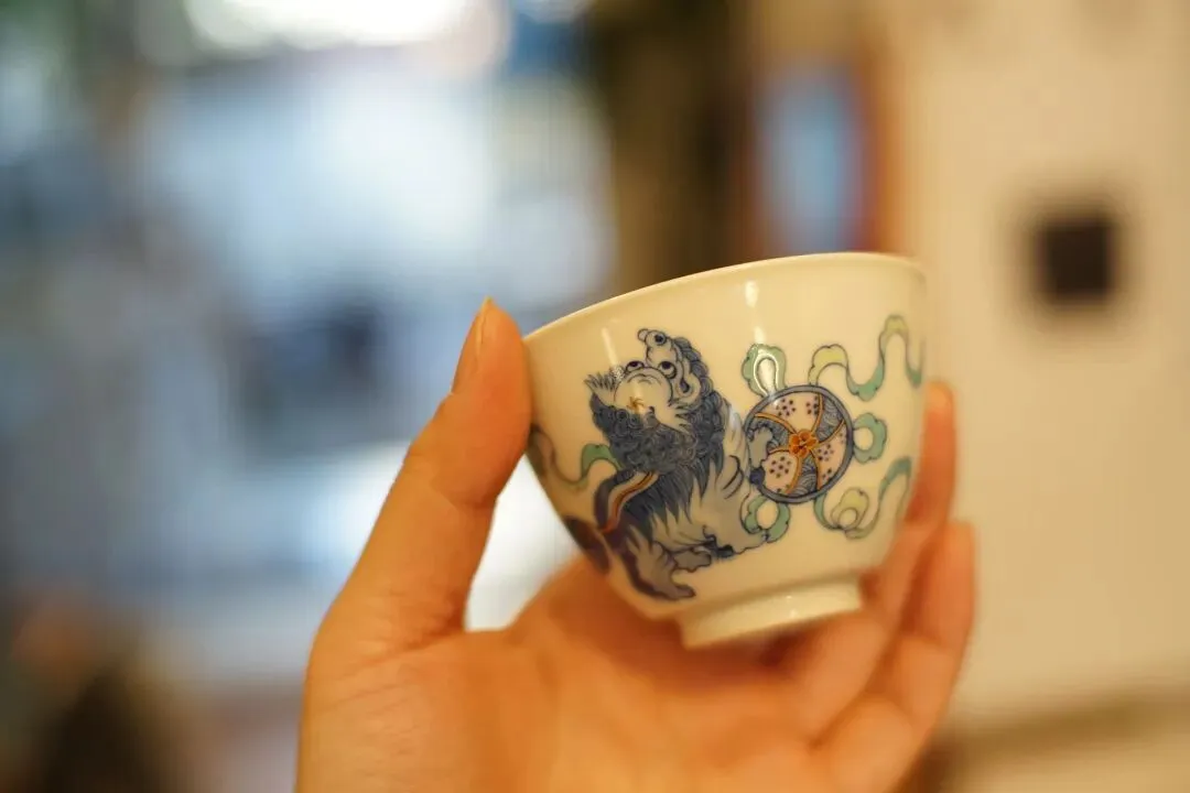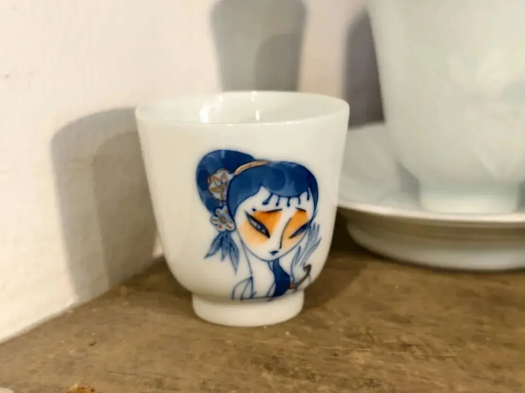 拿的是不同两个手工瓷杯,前者杯体上是蓝色的文人山水画,后者是灵动创意感的手绘。