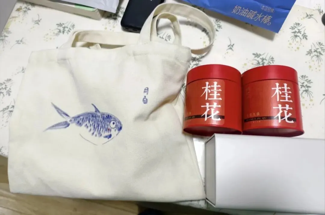 买好茶,老板拿出帆布包,问我喜欢什么,想了想说自己喜欢鱼,她立马掏出布绘笔,给我画了一条蓝色的鱼,肥乎乎的,好可爱、好喜欢啊!
