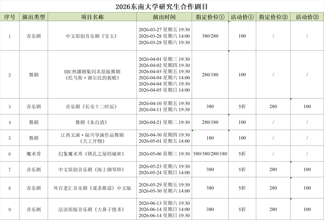 2026年度有购票观剧需求和计划的研究生请于3月13日8:00-3月19日24:00,通过“数智东南APP→工作台→学业生活→素养讲座”或“综合服务大厅→素养讲座”进行线上预约,逾期无效。