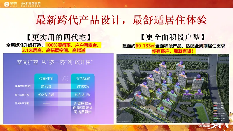 打破四代宅 = 大户型的刻板印象,69㎡起步就能拥有空中露台 + 高赠送,实得率接近 100%,同面积段空间感碾压竞品。