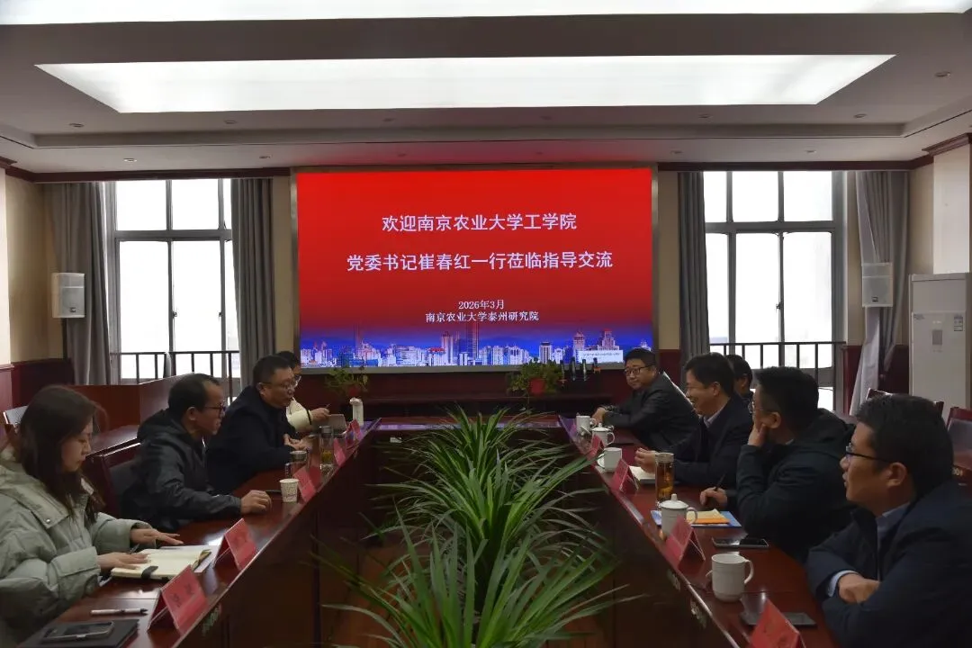 2026年3月9日,南京农业大学工学院党委书记崔春红,副院长(主持工作)肖茂华,副院长薛金林、邱威,办公室主任郭彪一行莅临我院调研指导。南京农业大学泰州研究院院长姜小三、常务副院长杨青陪同。双方围绕农业智能装备的产业发展与顶层设计的主题在研究院507会议室开展座谈。