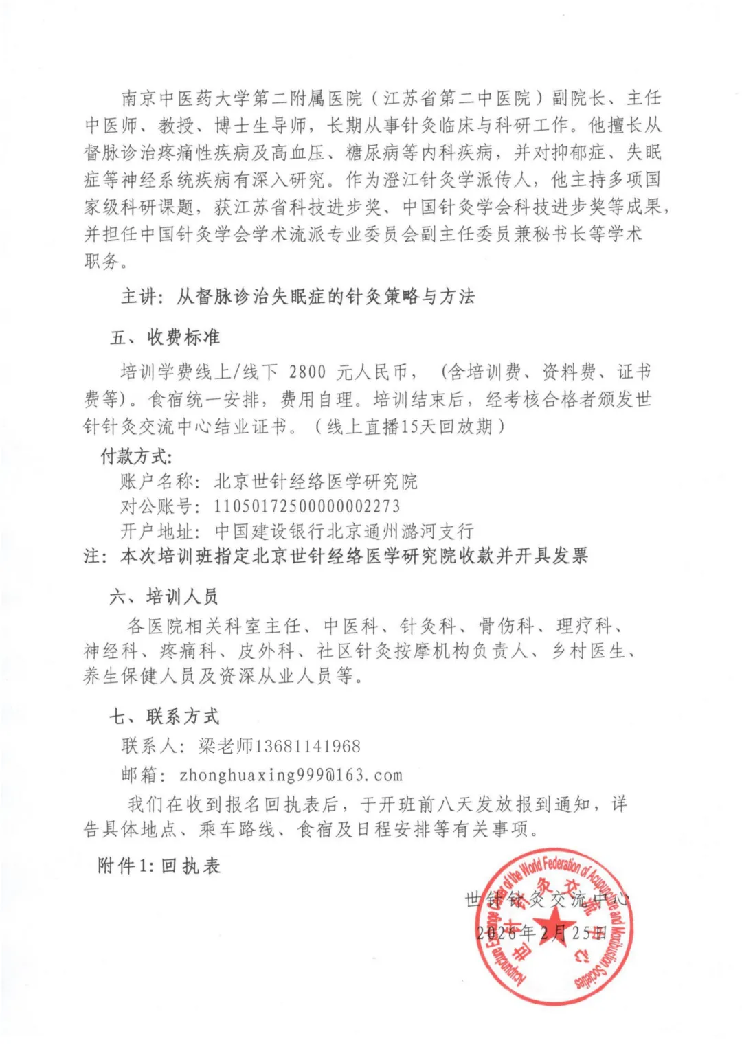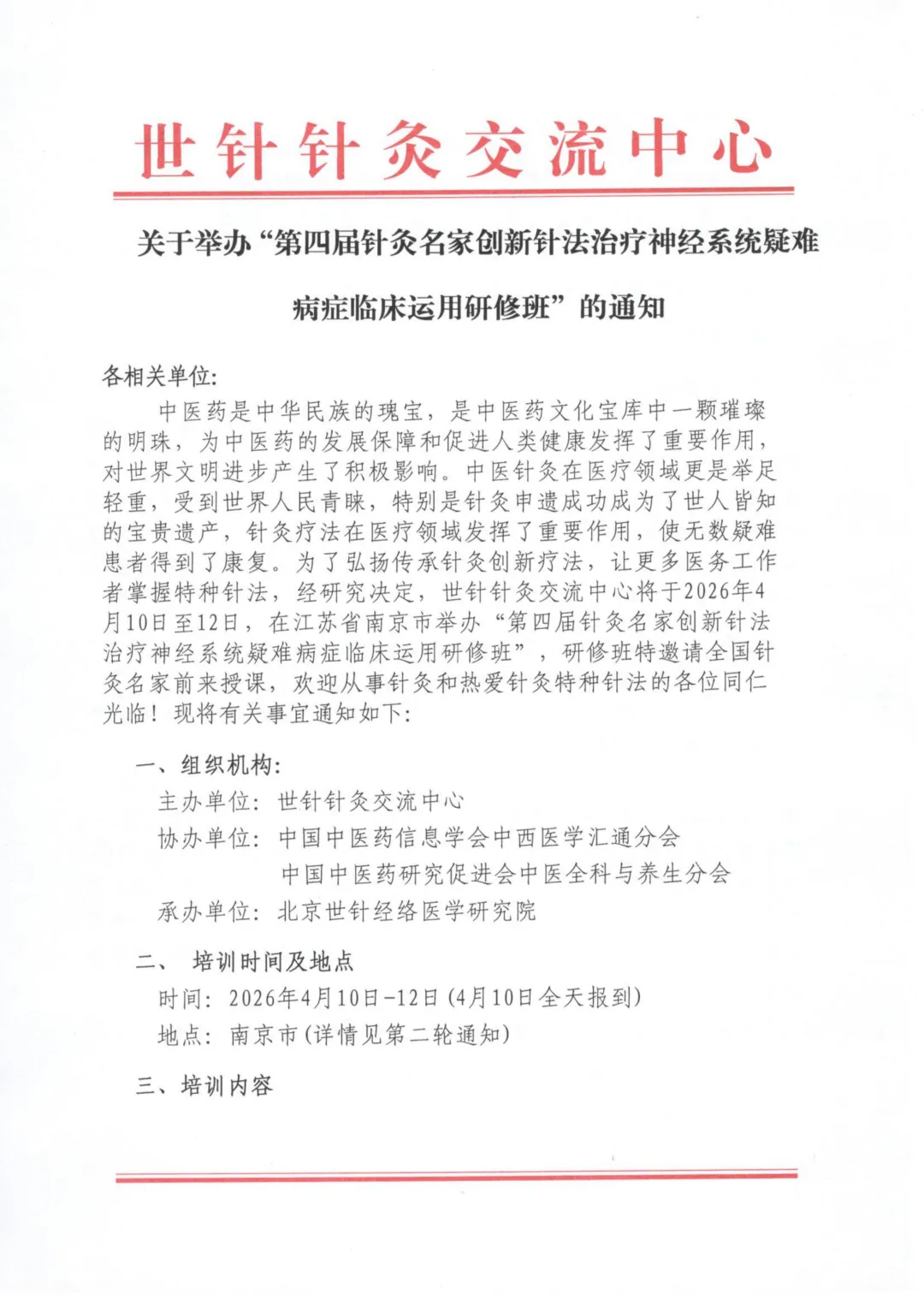 2026年4月10-12日(江苏南京)第四届针灸名家创新针法治疗神经系统疑难病症临床应用研修班