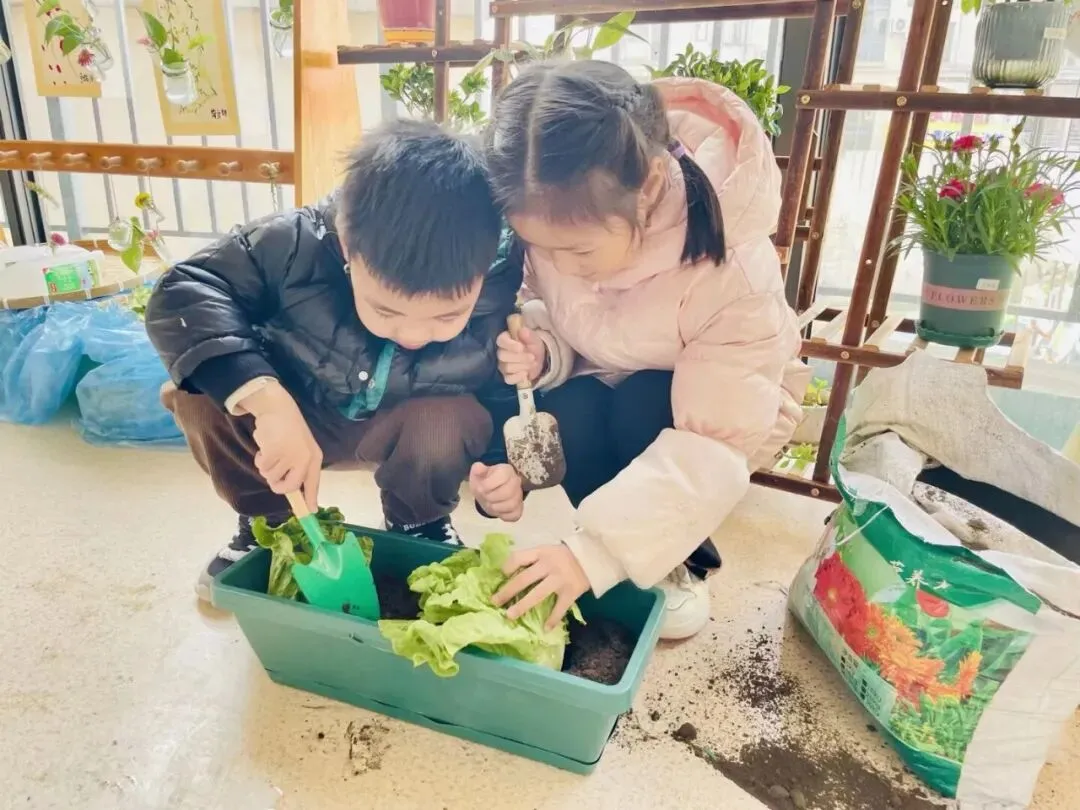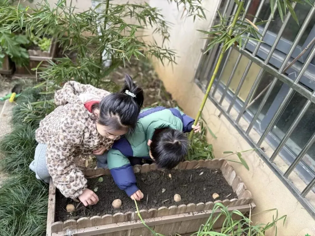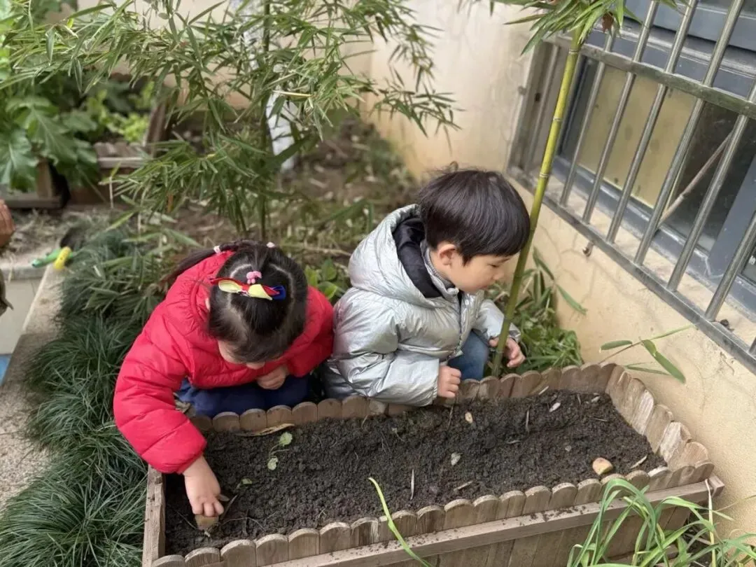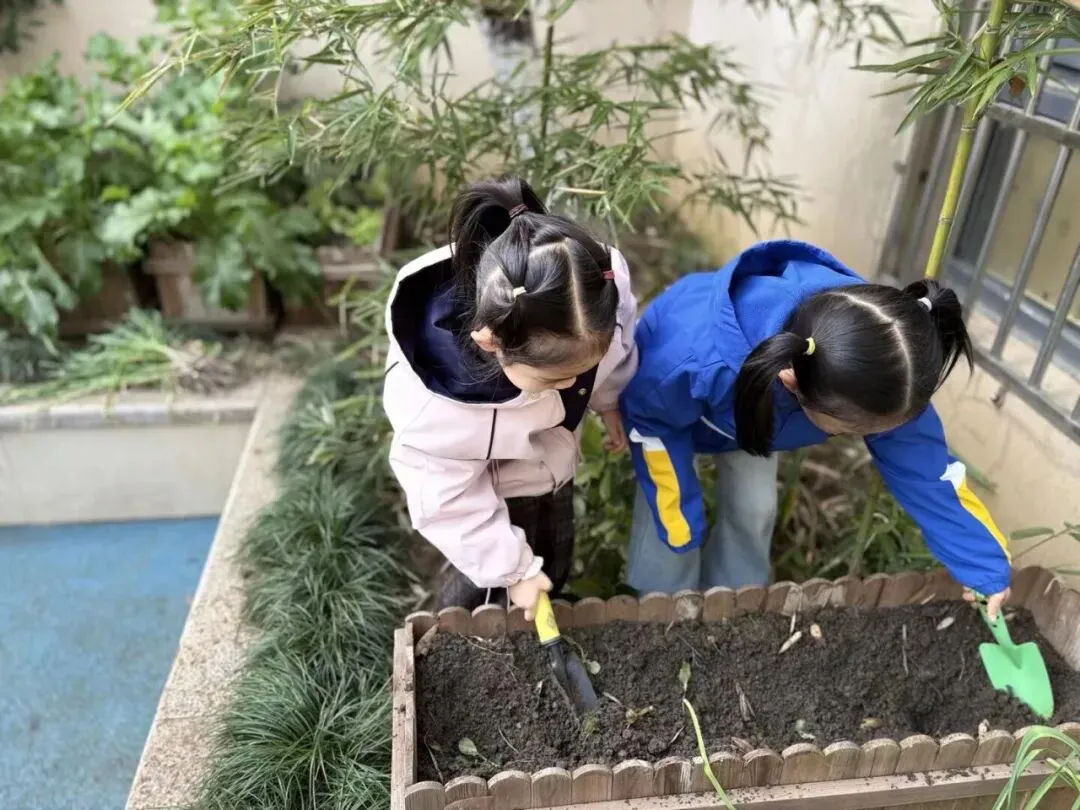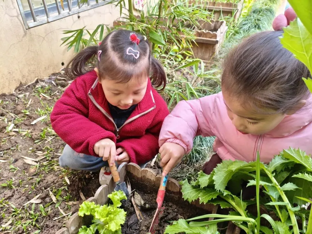 宝贝们在老师的带领下播种。有的孩子双手紧紧握着小锄头,屏气用力,一下一下翻着土,额头冒出细密的汗珠,打湿了碎发;还有的孩子两两一组,一个挖小坑,一个放秧苗,配合默契,时不时还交流着经验,欢声笑语回荡在种植园。声声稚气,句句童真,难掩孩子们对植物的关注和喜爱。