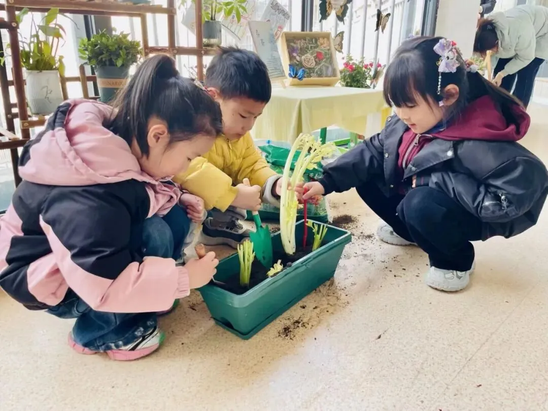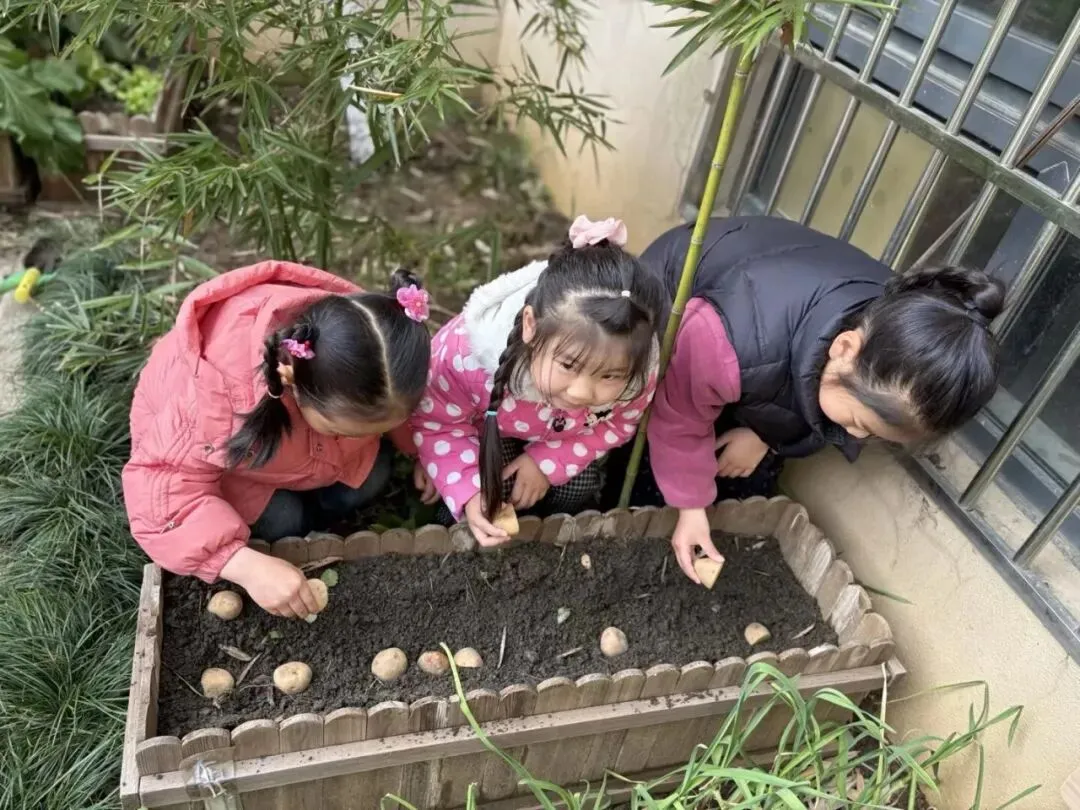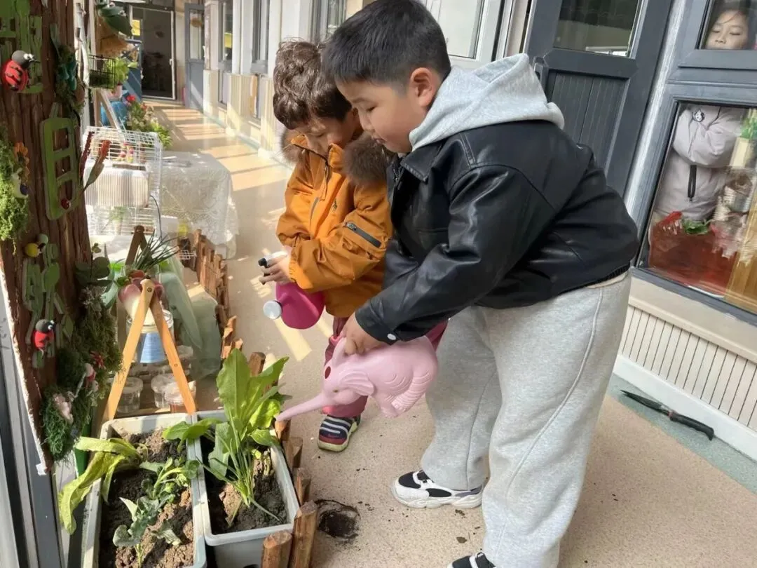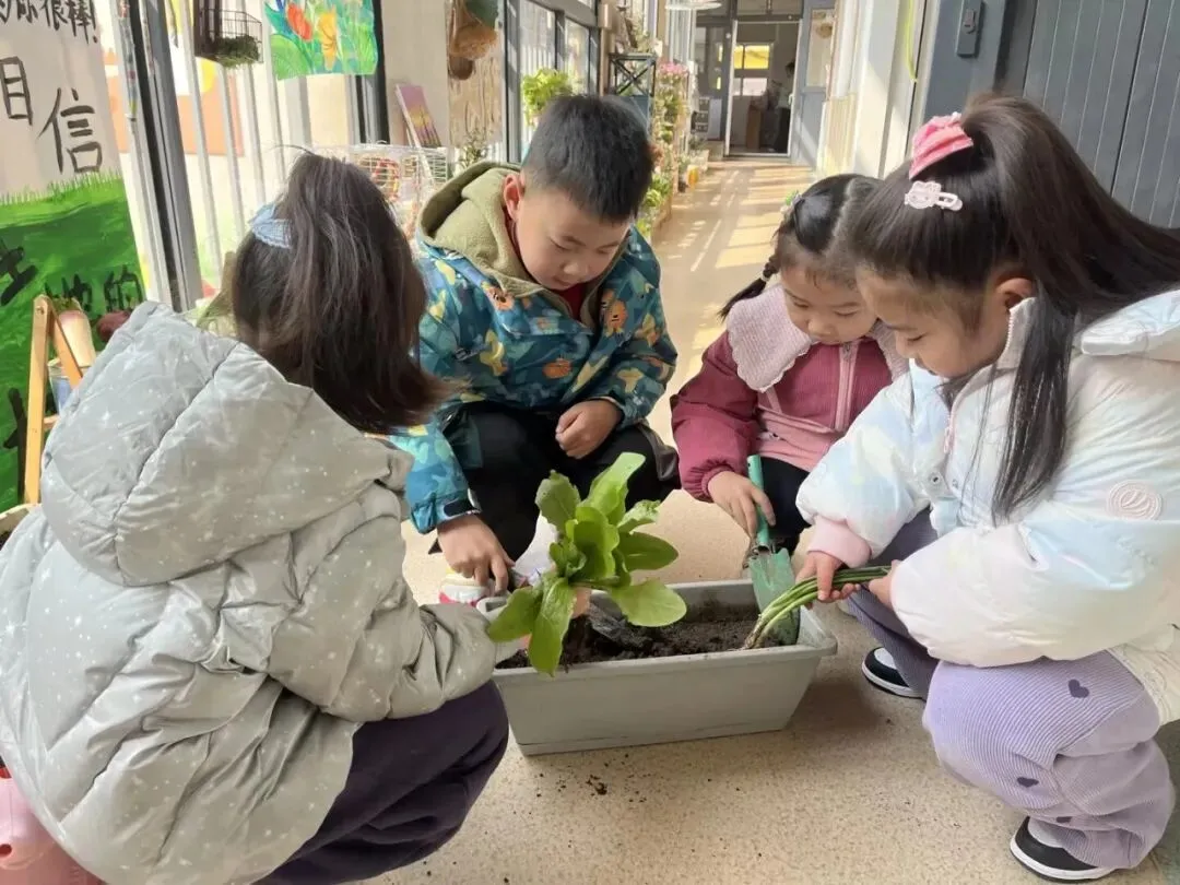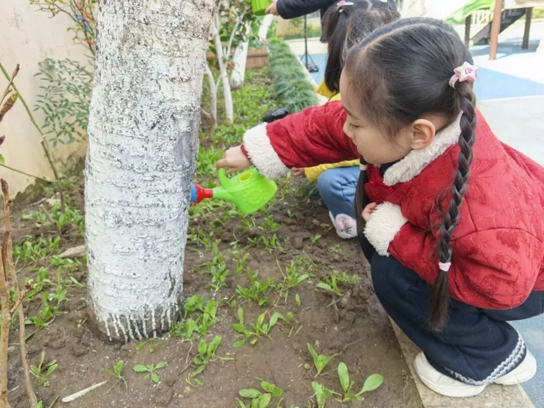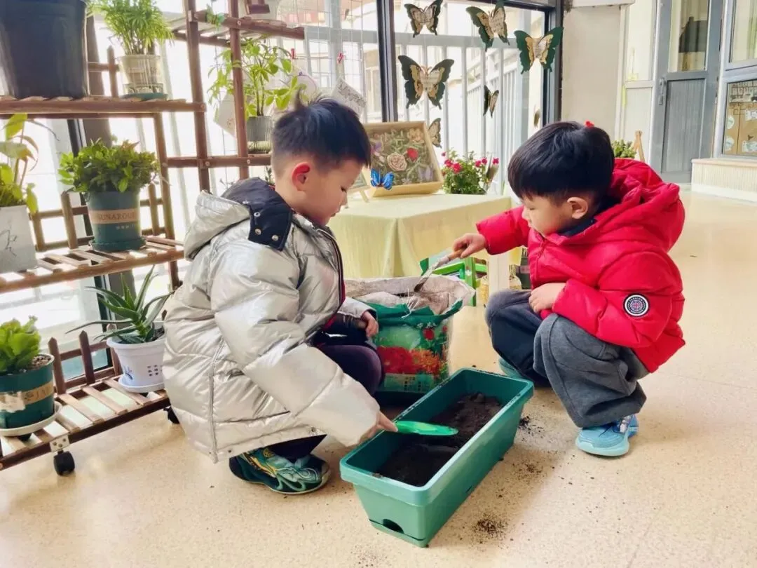 宝贝们在老师的带领下播种。有的孩子双手紧紧握着小锄头,屏气用力,一下一下翻着土,额头冒出细密的汗珠,打湿了碎发;还有的孩子两两一组,一个挖小坑,一个放秧苗,配合默契,时不时还交流着经验,欢声笑语回荡在种植园。声声稚气,句句童真,难掩孩子们对植物的关注和喜爱。