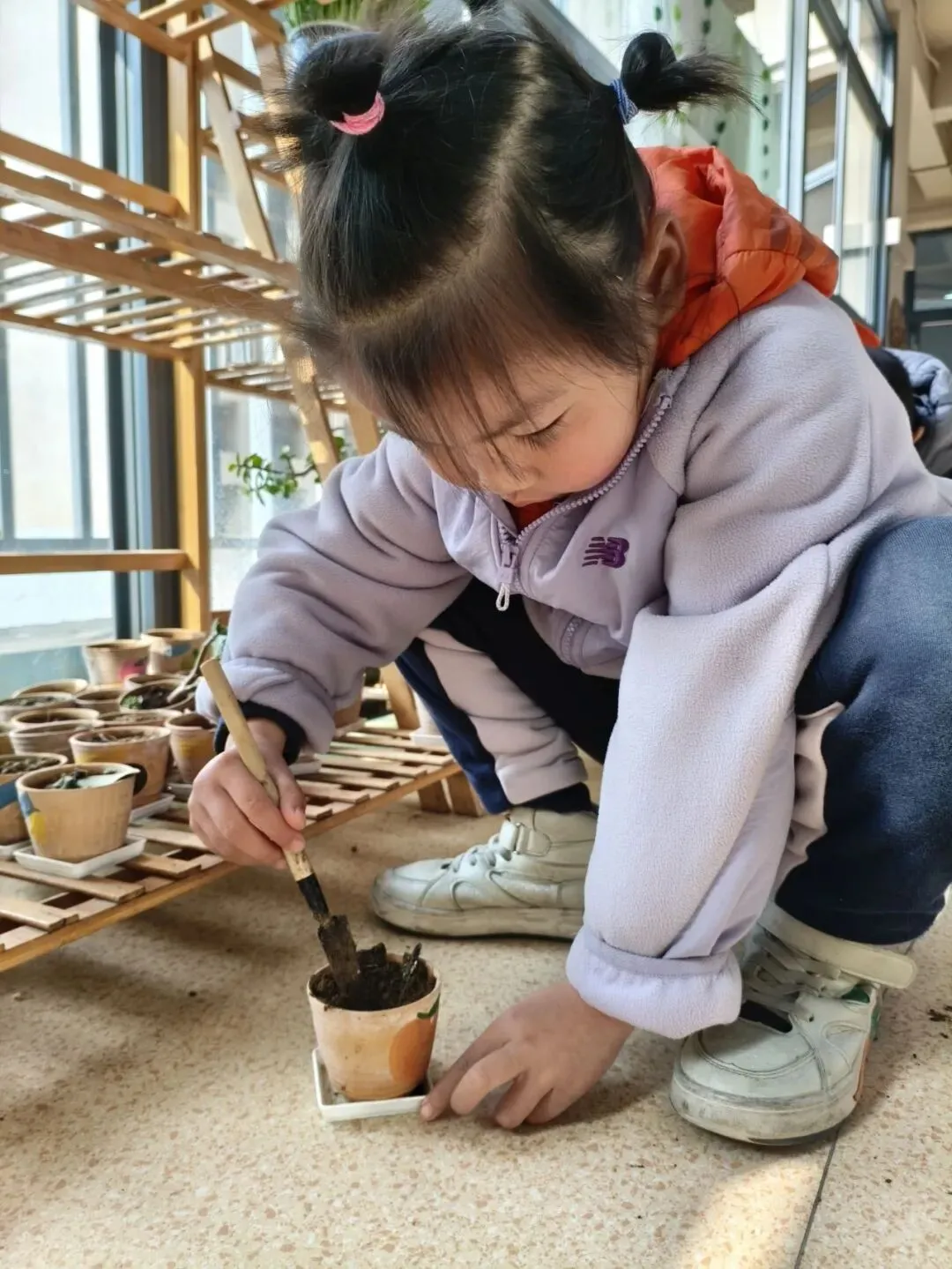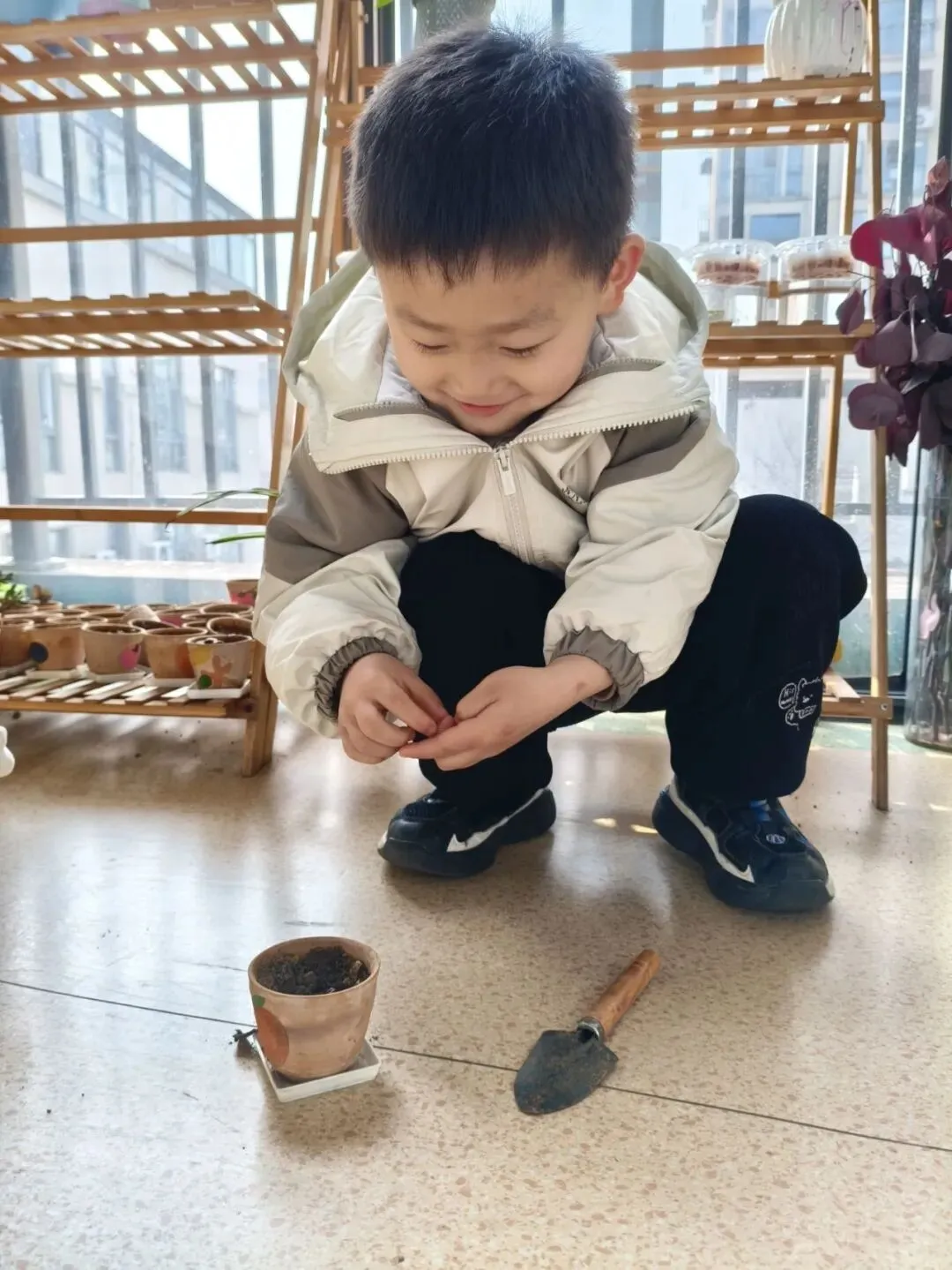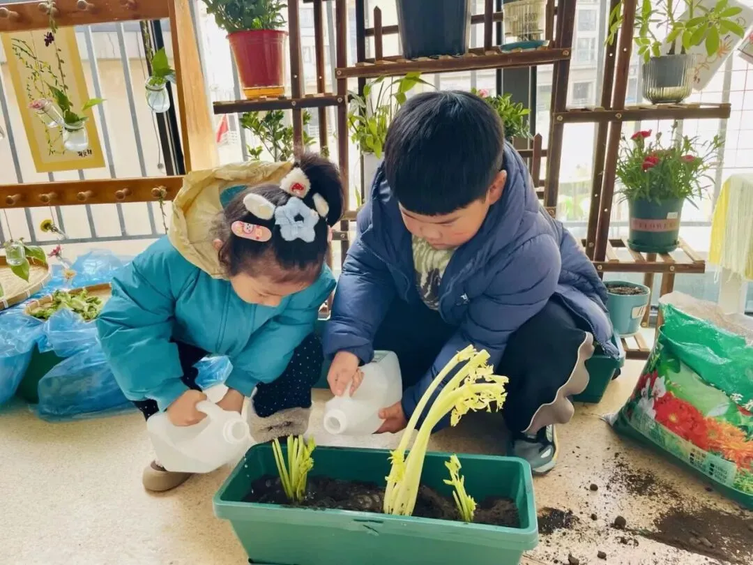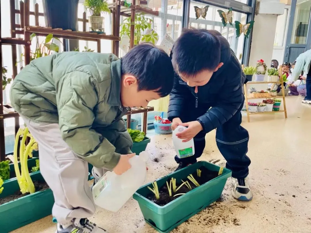 宝贝们在老师的带领下播种。有的孩子双手紧紧握着小锄头,屏气用力,一下一下翻着土,额头冒出细密的汗珠,打湿了碎发;还有的孩子两两一组,一个挖小坑,一个放秧苗,配合默契,时不时还交流着经验,欢声笑语回荡在种植园。声声稚气,句句童真,难掩孩子们对植物的关注和喜爱。