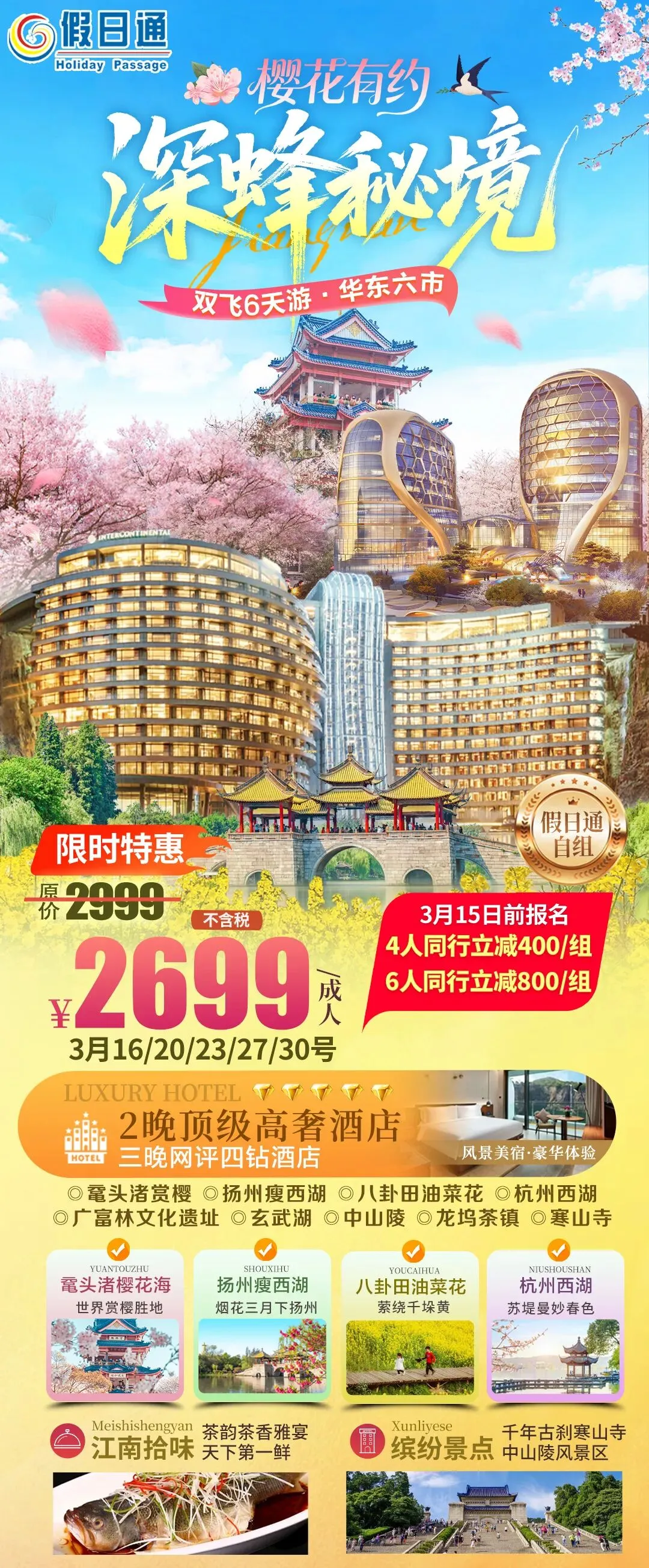 西湖苏堤春晓+八卦田油菜花+古风春韵广富林+玄武湖春日盛宴+千年古刹寒山寺+中山陵