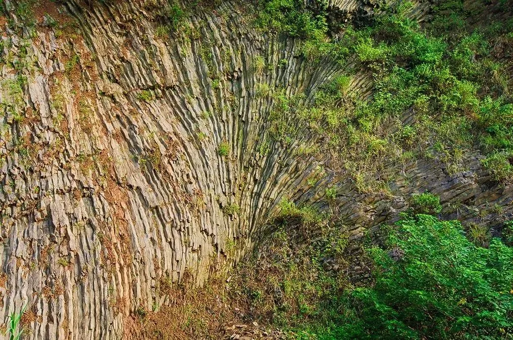 1️⃣孔雀开屏:由火山喷发后玄武岩冷却形成的石柱群构成,石柱呈放射状排列,形似孔雀展屏,最高达70米。
