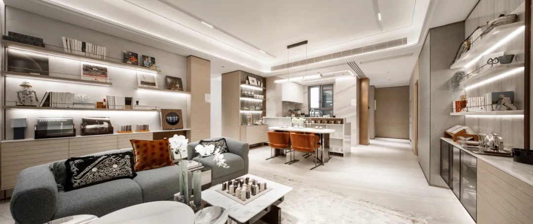 户内全面搭载华为鸿蒙智家系统,通过智能中控屏或手机APP,可一键控制灯光、空调等,并预设“会客”、“观影”等多种场景模式。