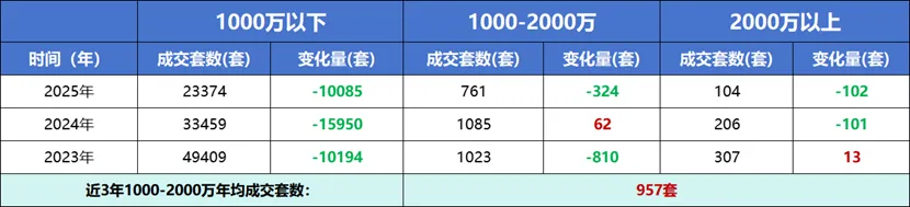 1000-2000万高端改善市场,近3年年均成交规模接近1000套,整体成交缩量幅度远低于其他总价段,且2024年实现逆势正增长,成为难得正向增长的总价区间,展现出较强的抗周期韧性。
