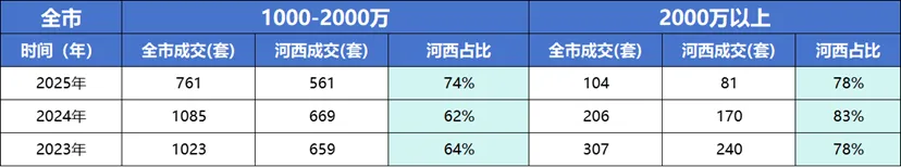 同时,河西1000-2000万及2000万以上成交全市占比维持在7-8成,河西凭借成熟的配套、稀缺的资源与稳固的板块认知,依然是高端改善需求集中释放的首选区域。