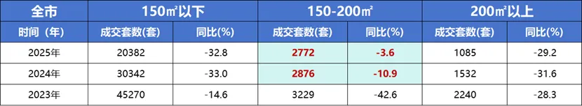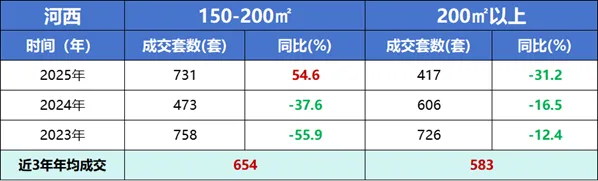 从分面积段的成交结构看,2025年150-200㎡面积段成交仅同比下降3.6%,需求韧性可见一斑。这一趋势在河西板块尤为明显。2025年河西150-200㎡成交达731套,逆市增长54.6%,一方面受供应端影响,另一方面也反映高品质改善产品在核心区域仍受追捧。