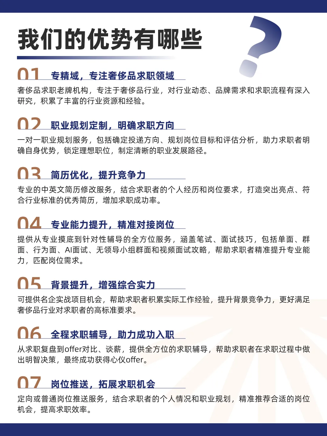 🔸首批专注奢侈品求职的辅导机构,为奢侈品行业求职者提供专业且系统的方案,持续赋能职业发展