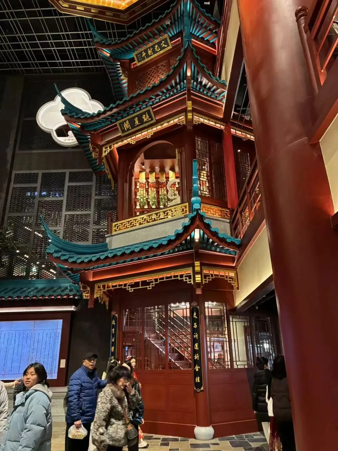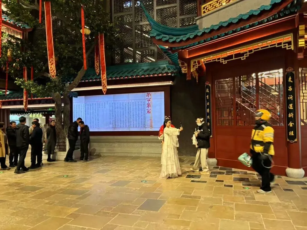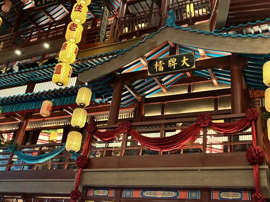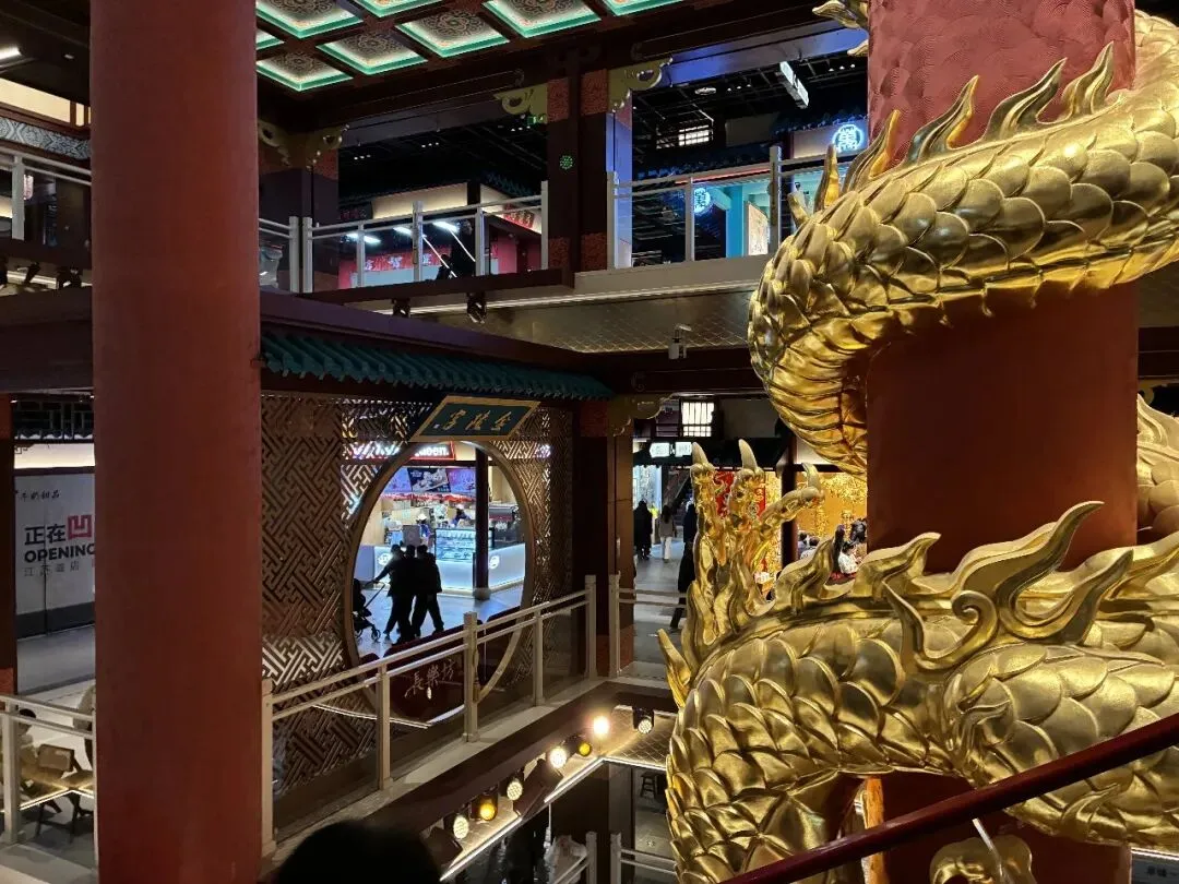 我们站在二楼,迎面看到"第一甲第一名"大红字的告示,再看看看室内装饰以中式传统风格为主,朱红梁柱、青绿彩画枋、黄绿琉璃瓦、仿古铜金属等元素出现于空间,飞檐翘角与斗拱结构让人感受到明代建筑的神韵。魁星阁、金榜题名墙、金陵帝王州码头等核心场景错落分布搭配魁星鳌鱼雕像、蟠龙柱、金龙雕塑等特色景致再现六百年前的金陵风韵。抬头一看,朱红色古色古香门窗栏杆附近,橘黄色灯笼旁的"大牌檔"(主打南京传统小吃和金陵菜肴的饭店)字体十分显眼,这是将明朝建筑风格与南京餐饮文化有机结合。