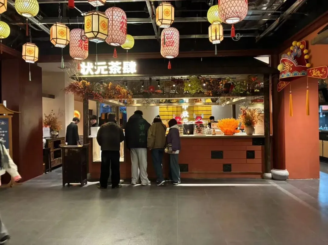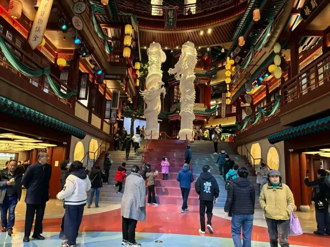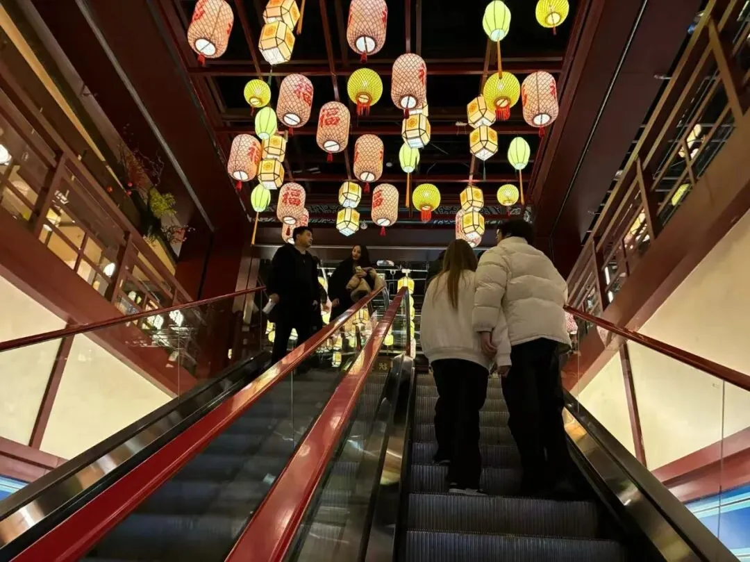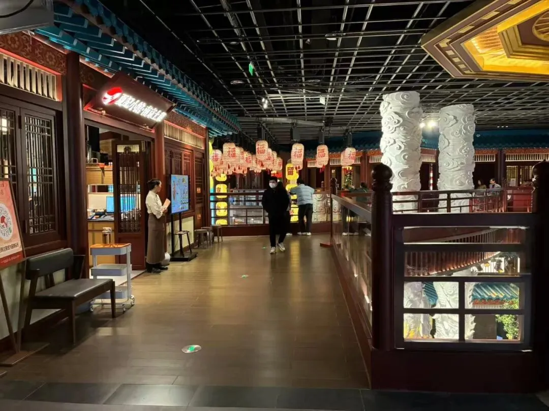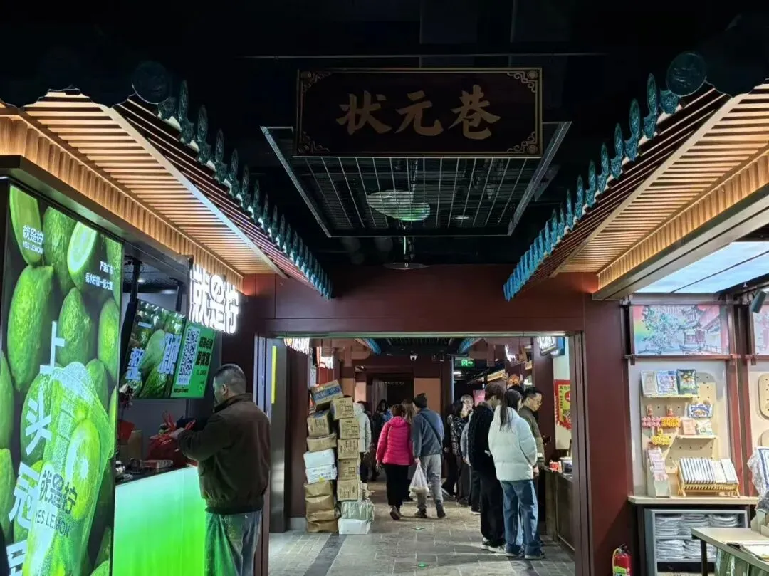 我们站在二楼,迎面看到"第一甲第一名"大红字的告示,再看看看室内装饰以中式传统风格为主,朱红梁柱、青绿彩画枋、黄绿琉璃瓦、仿古铜金属等元素出现于空间,飞檐翘角与斗拱结构让人感受到明代建筑的神韵。魁星阁、金榜题名墙、金陵帝王州码头等核心场景错落分布搭配魁星鳌鱼雕像、蟠龙柱、金龙雕塑等特色景致再现六百年前的金陵风韵。抬头一看,朱红色古色古香门窗栏杆附近,橘黄色灯笼旁的"大牌檔"(主打南京传统小吃和金陵菜肴的饭店)字体十分显眼,这是将明朝建筑风格与南京餐饮文化有机结合。