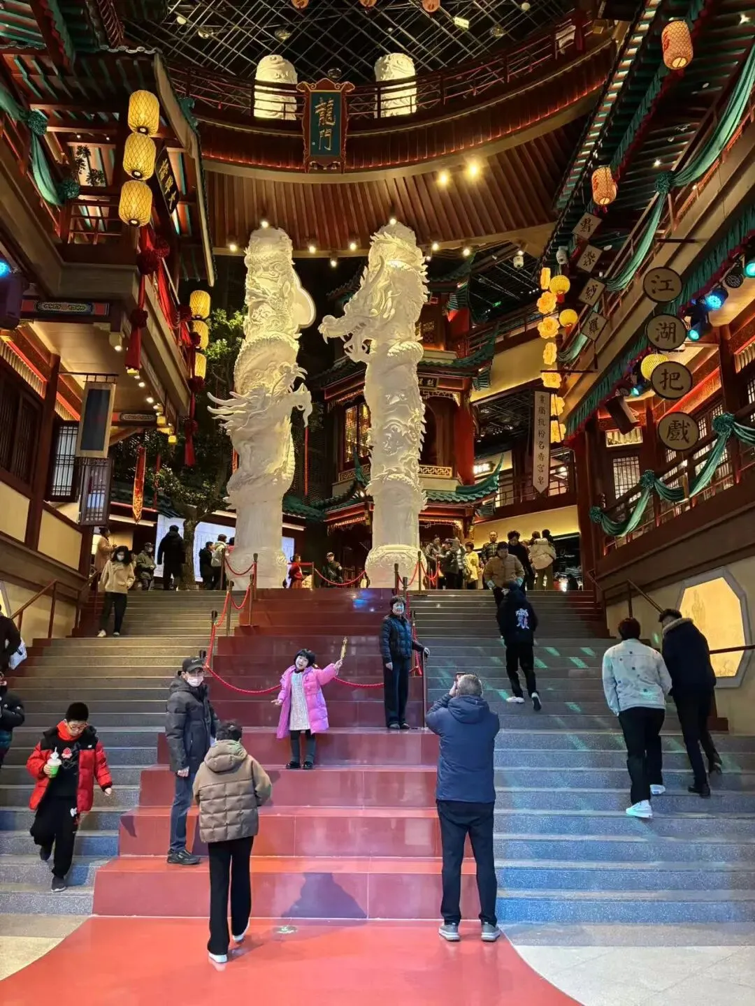 "舞榭歌台,风流总被雨打风吹去。"(宋代辛弃疾诗)我们刚刚走进门厅,立即被气势恢宏的两大白色龙柱,朱红梁柱、斗拱飞檐、青绿彩画、还有一盏盏灯笼的古典场景(后知是金陵宫中庭:殿试场景)所震撼。"龙门"字下,红色步道上,一级级往上的台阶,令人想到“步步高升”的寓意,巧夺天工。右边悬挂的"江湖把戲"四个字,令人捧腹。我们顺着台阶,一步步走到二楼。