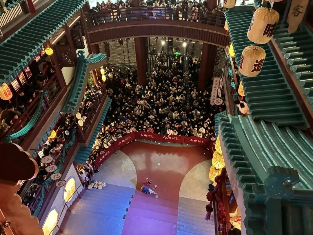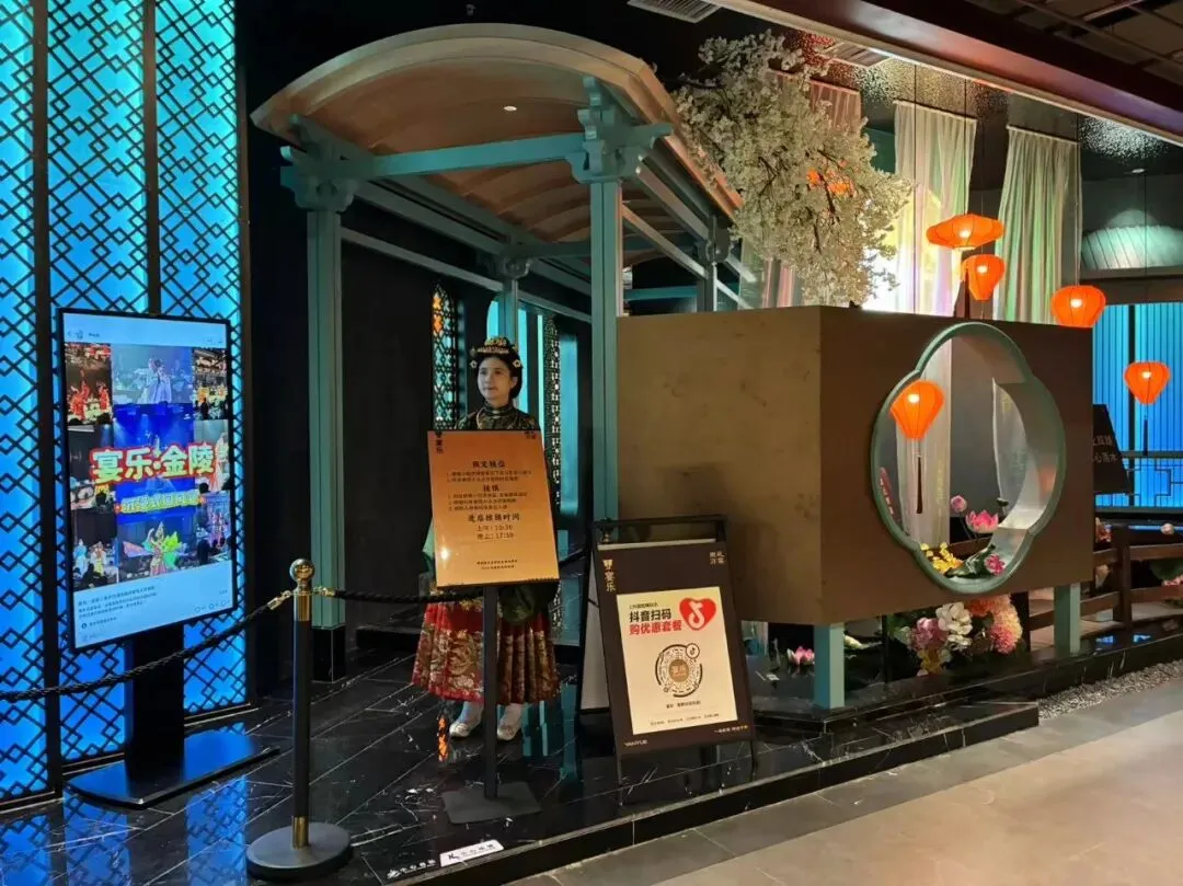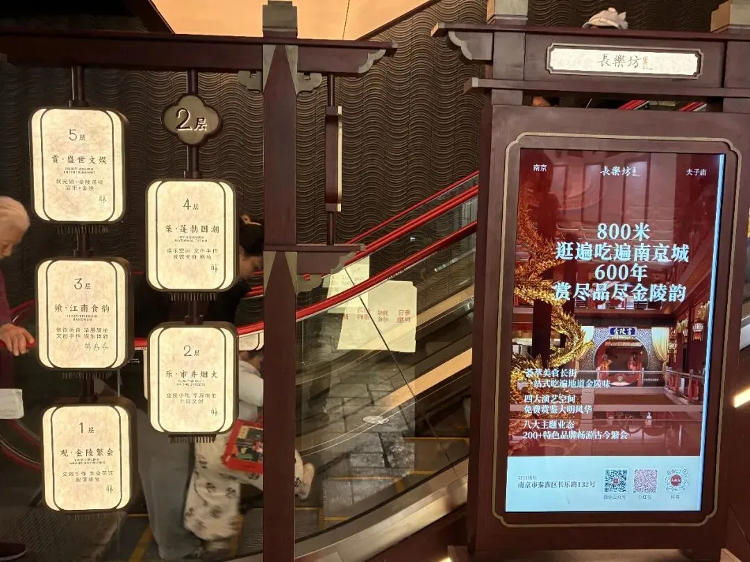 金陵长乐坊并非单一展陈场所,它定位为城市文化综合体,集合了非遗百工、博物空间、在地文创、文化服饰、妆造旅拍、主题餐饮、金陵美食及茶娱空间等八大业态。"800米逛遍吃遍南京城,600年赏尽金陵韵。"我站在告示牌前,从"金陵宫"字样,看到"荟萃美式长衔,一站式吃遍地道金陵味。"以及"四大演艺空间,免费赏鉴大明风华。"还有"八大主题业态,200+特色品牌畅游古今繁会。"宣传,这是将长乐坊的特色,还有每层楼的内容,充分展现在我们眼前,道出了商家的良苦用心,也是现场的真实写照。
