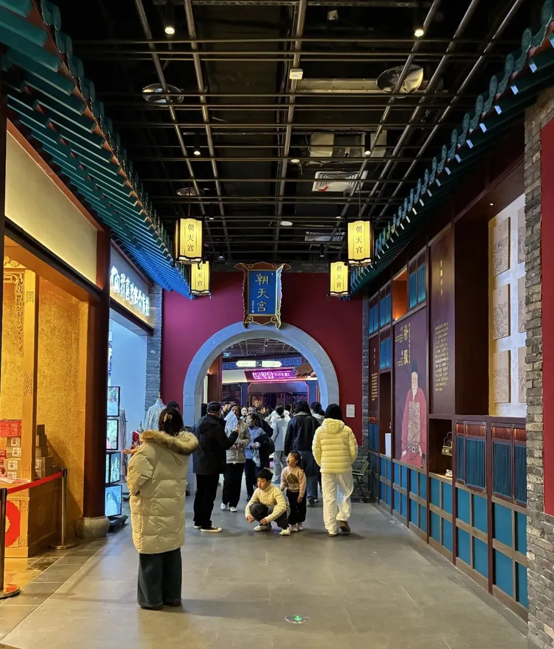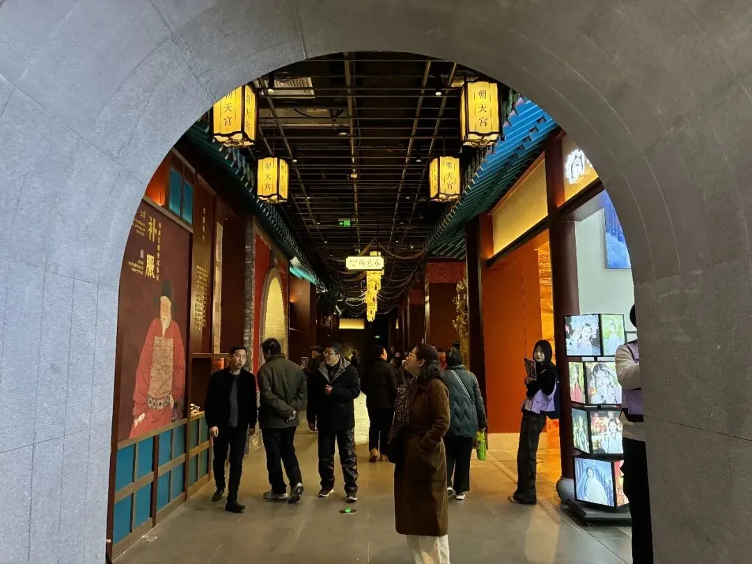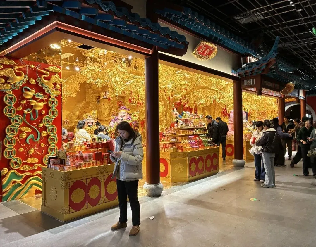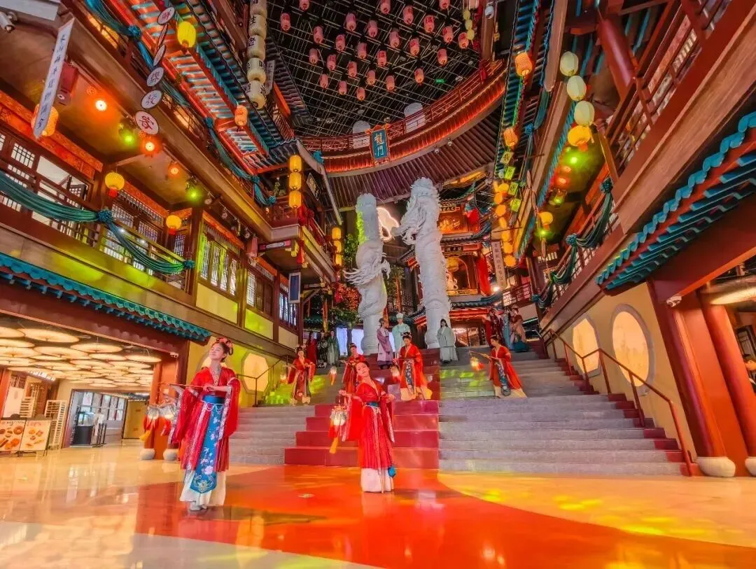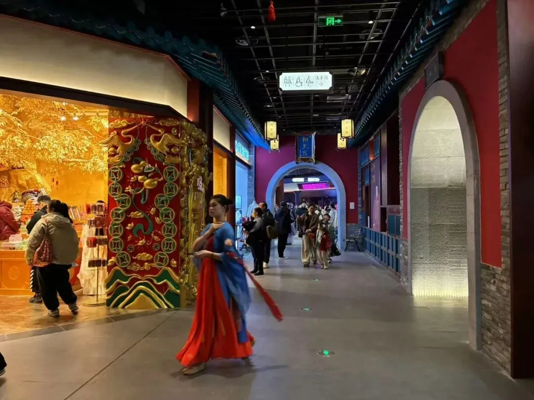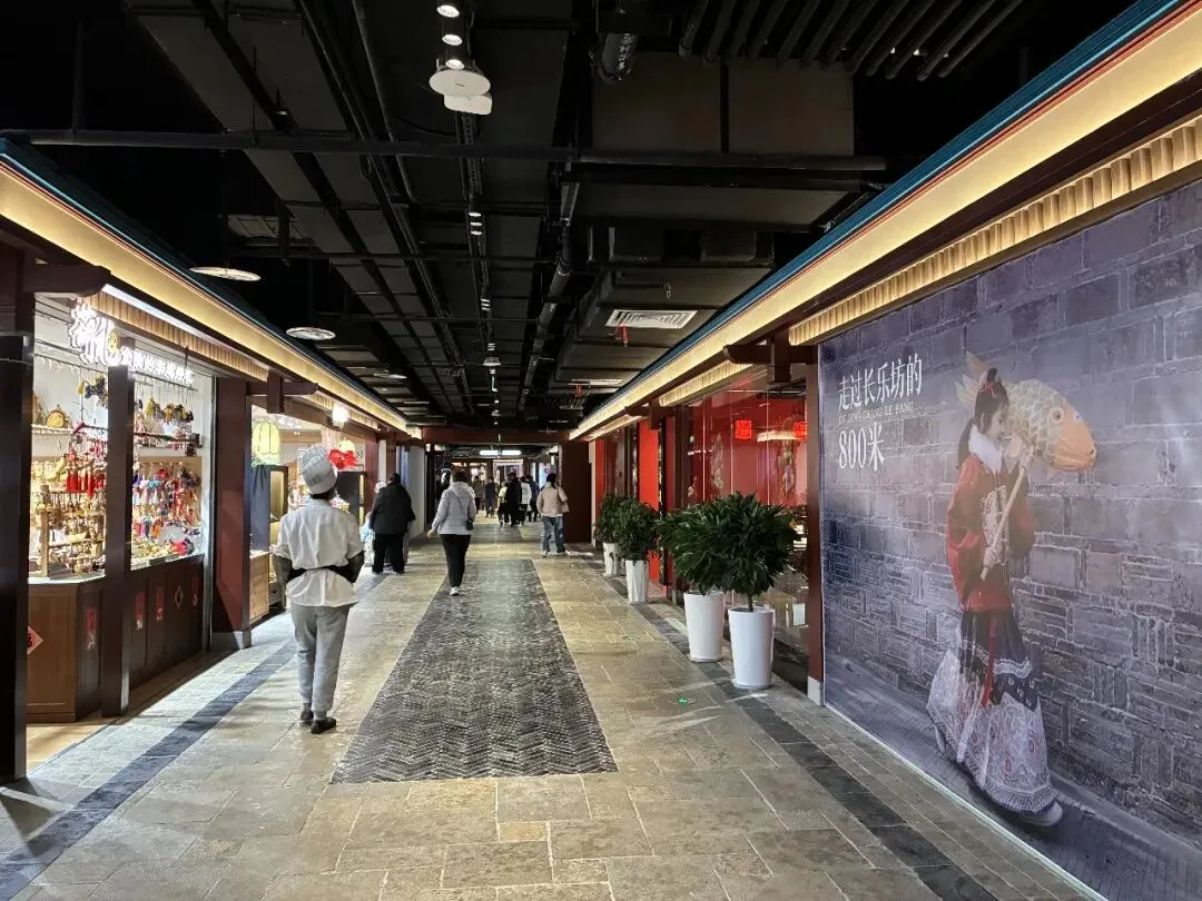 "盛世大明"。在长乐坊,我们每层楼都转转看看,虽说是走马观花,但这里将商业消费场景融入室内景区之中,真的令人刮目相看,即通过游览体验与消费场景深度融合模式,实现文旅观光与商业消费的相互促进,协同发展。我们在"朝天宫"展区右转到了"财神殿",即有身穿古装的引导员,还有古风满满的店铺,有种身处大明朝代某个街市的感觉,真的很好,很喜欢。