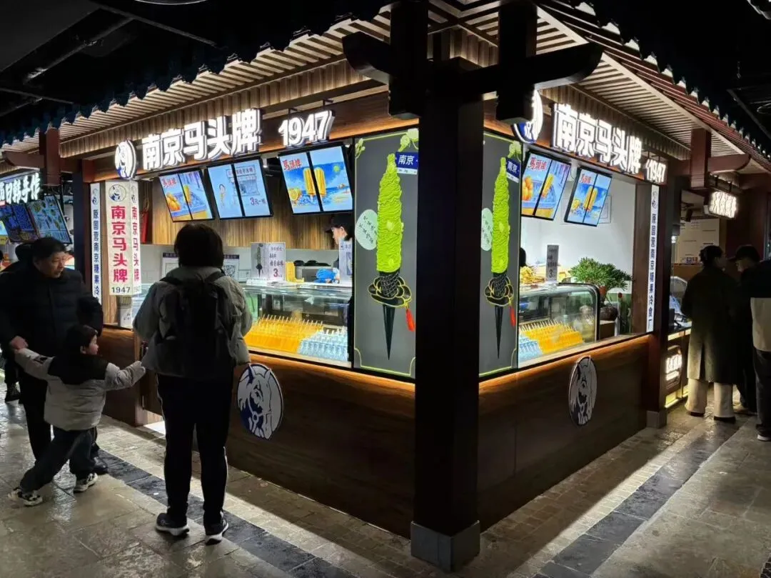 "民以食为天。"我们在二楼品尝过南京臭豆腐干特色小吃,刚刚左转就看到"安姬酸奶"招牌,我们知道这是时令饮品,美味可口,当即扫码下单购买。一转身又看到"南京马头牌 1947 "字样,顿时勾起了我满满的回忆:"冰棒马头牌。马头牌冰棒。"上世纪六七十年代传遍南京城的吆喝声,又在我耳边响起。我走到柜台前问价格:"桔子冰棒3元一根,奶油冰砖8元一个。"售货员的回答,我毫不奇怪,更不在意。再看左右前后,再行走看看,满满的是小吃街区:鸭血粉丝汤、西北桥头拉面大王、左师傅梅花糕……