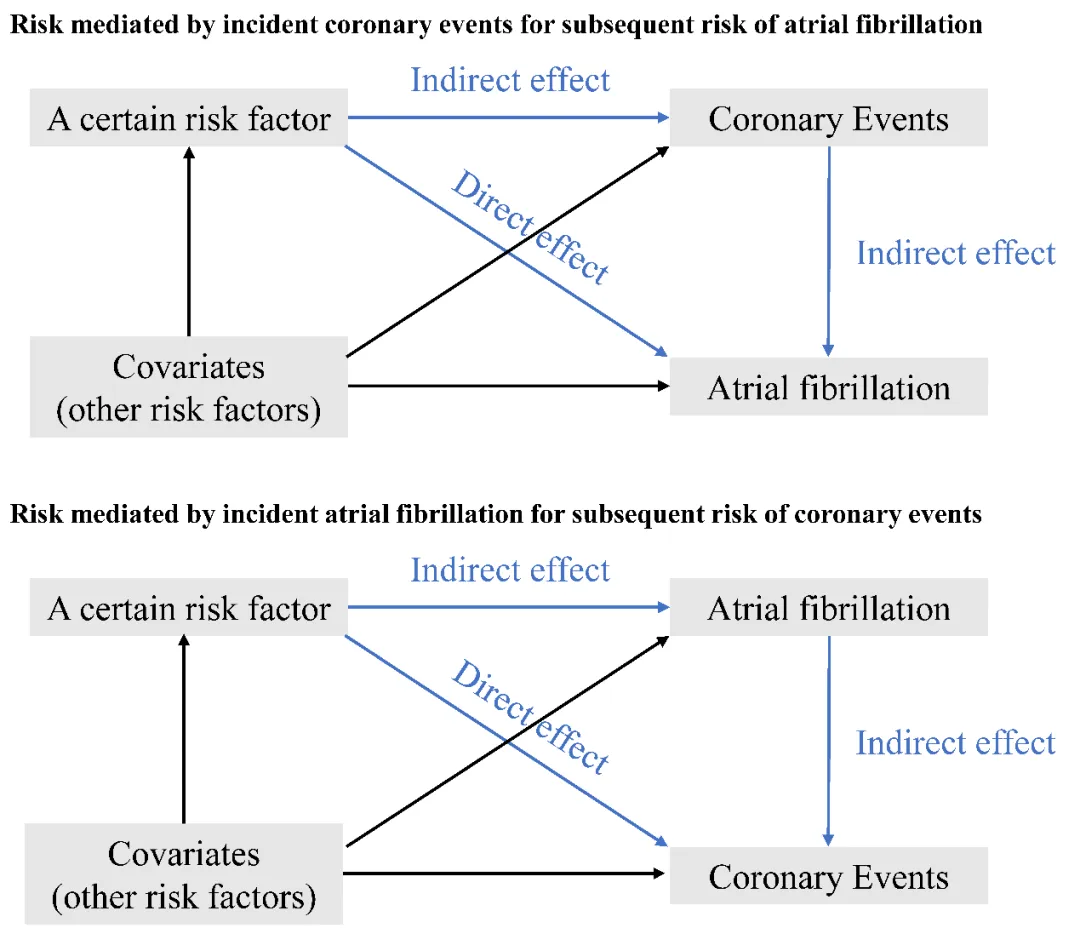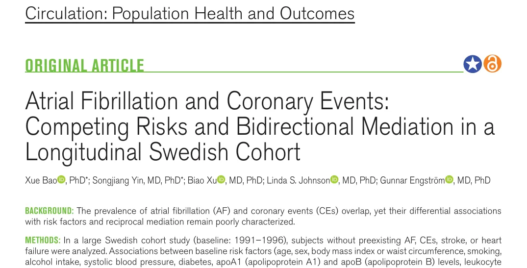 为进一步解析两者之间的互作关联,本研究基于大型队列研究,通过竞争风险分析定量比较各项因素对房颤及冠状动脉事件的影响强度,并利用中介效应分析识别特定的风险因素如何通过诱发其中一种疾病,进而增加另一种疾病的发生风险。该研究成果于2026年1月发表于中科院一区期刊《Circulation: Population Health and Outcomes》。该研究深入探讨了房颤与冠状动脉事件之间的复杂关系,为心血管疾病的预防和治疗提供了新的科学依据。