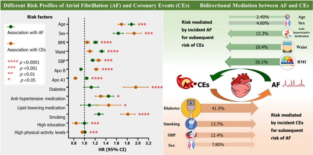 图1. 房颤与冠状动脉事件差异化风险谱及双向中介效应示意图