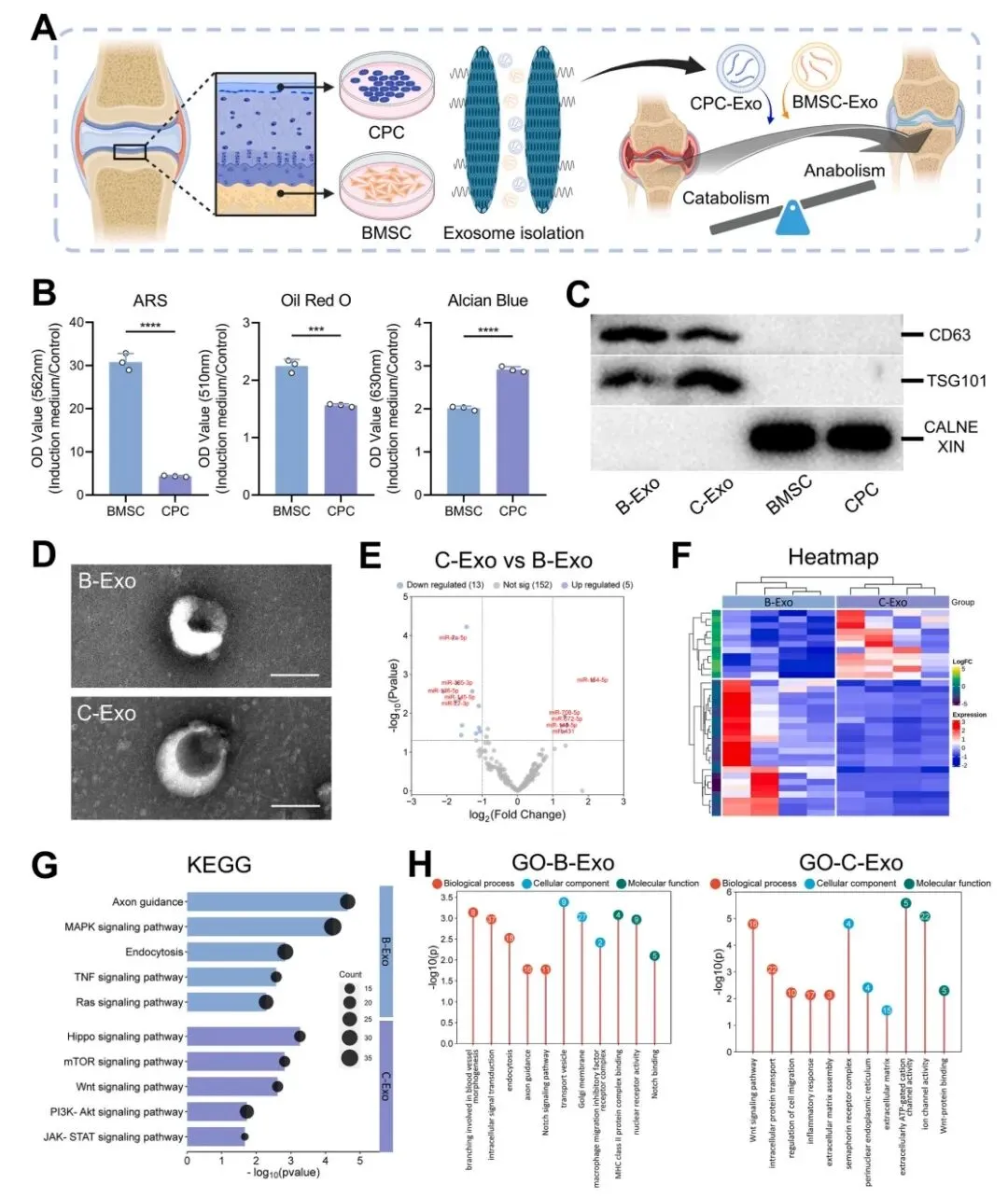 成功分离并鉴定了BMSCs和CPCs。两者三系分化潜能不同(BMSCs成骨/成脂强,CPCs成软骨强)。提取的外泌体(B-Exo, C-Exo)形态、大小、标志物无显著差异。miRNA测序显示两者富集的miRNA显著不同:B-Exo富集的miRNA主要涉及炎症和免疫调节通路(MAPK, TNF);C-Exo富集的miRNA主要涉及软骨合成与代谢通路(Hippo, Wnt),并调控ECM和细胞迁移。