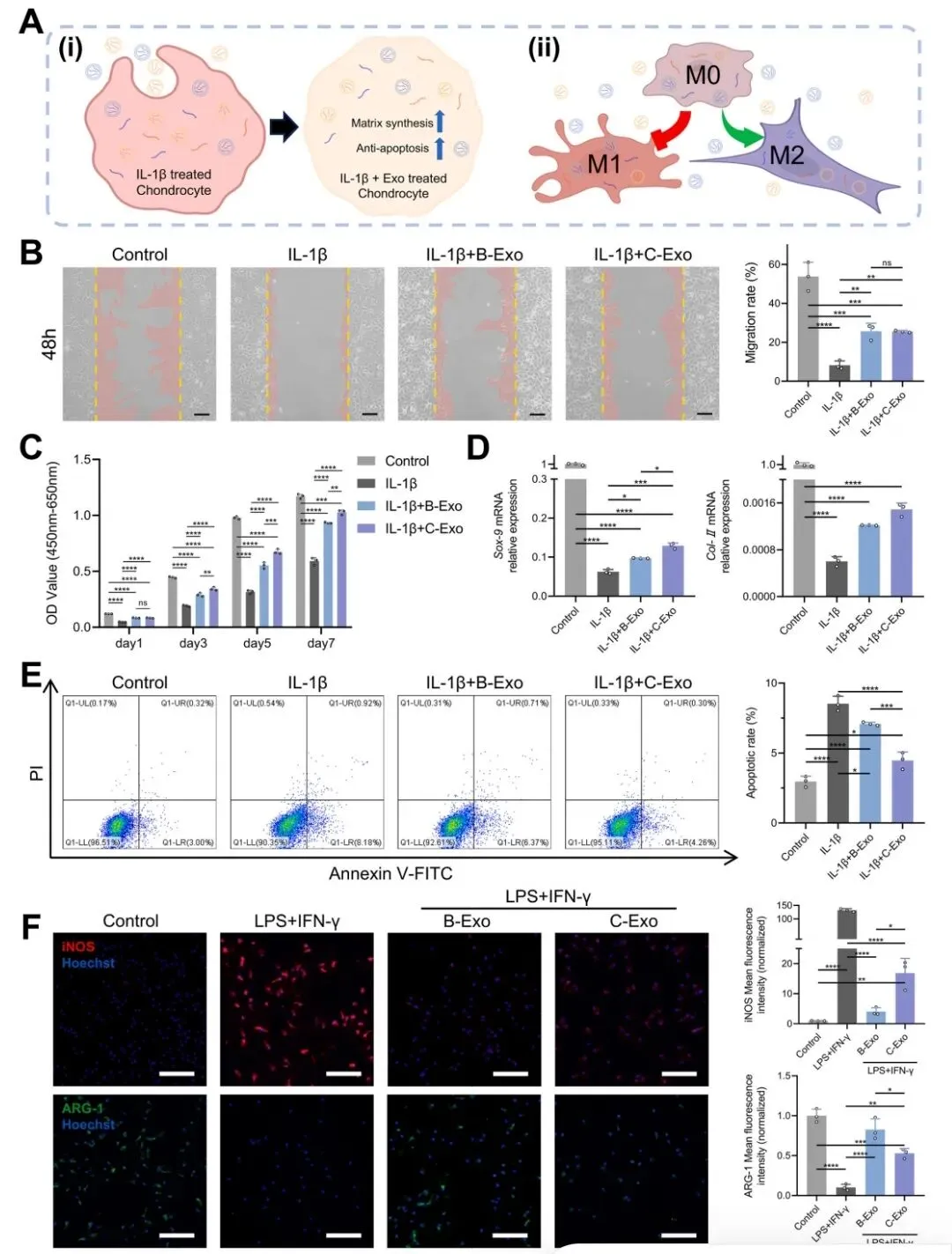 通过体外模拟OA环境(IL-1β刺激软骨细胞,LPS+IFN-γ刺激巨噬细胞),验证两者功能差异。C-Exo在促进软骨细胞增殖、ECM合成(Sox-9, Col-II)和抑制凋亡方面优于B-Exo。B-Exo在诱导巨噬细胞M2极化(抗炎)、抑制M1极化(促炎)方面优于C-Exo。
