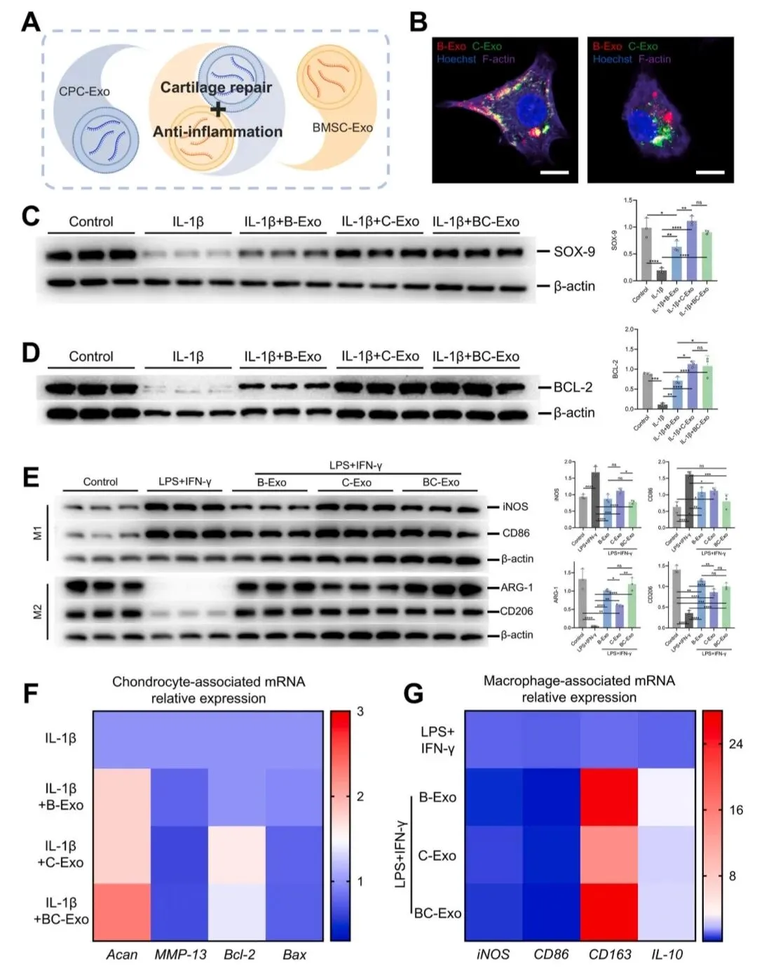 提出B-Exo和C-Exo联合(BC-Exo)策略。实验证明BC-Exo整合了二者的功能优势:在抗炎方面,效果与B-Exo相当,优于C-Exo;在促进软骨合成(Acan)、抑制分解(MMP13)和抗凋亡(Bcl-2)方面,效果与C-Exo相当,优于B-Exo。在共培养体系中,BC-Exo综合效果最佳。