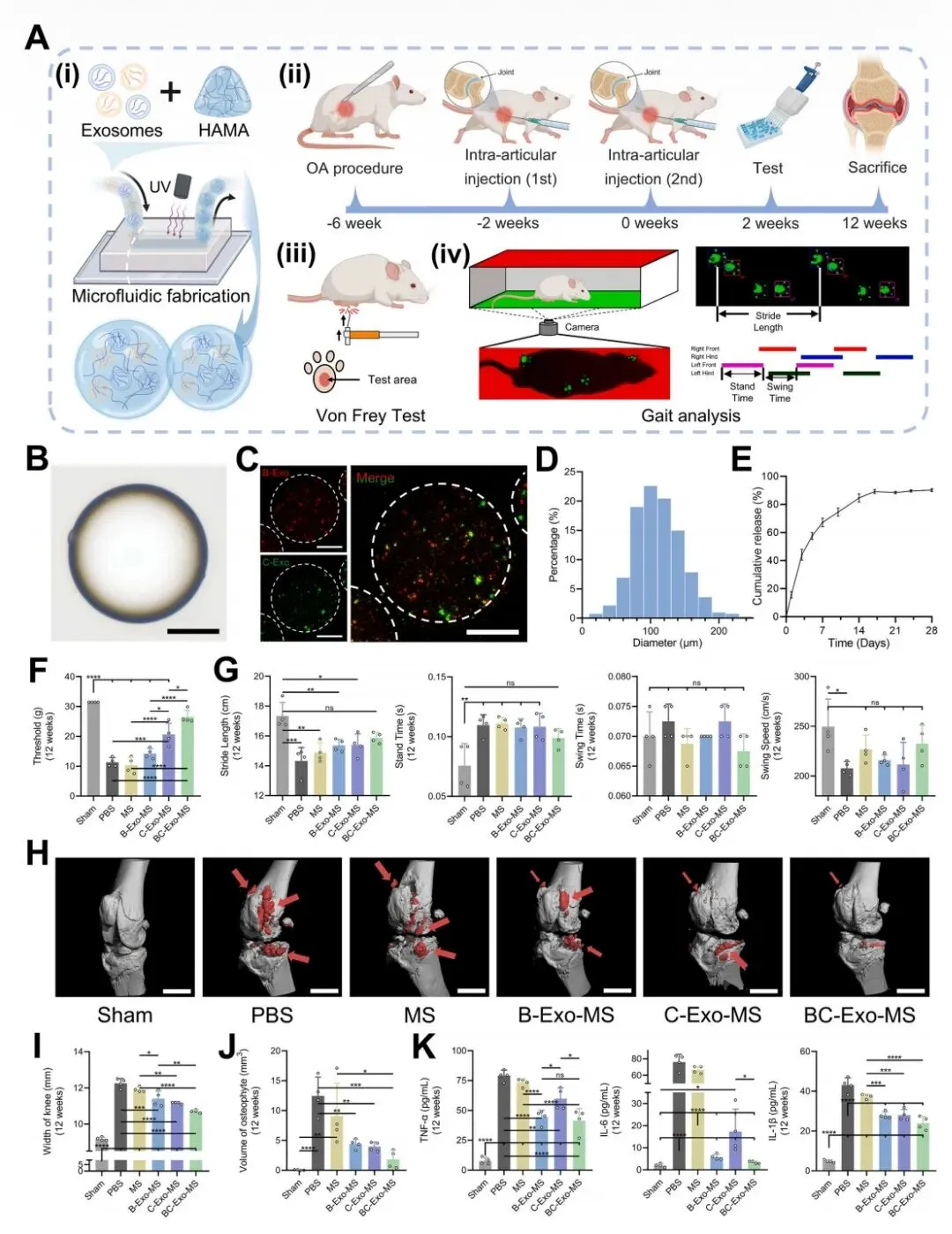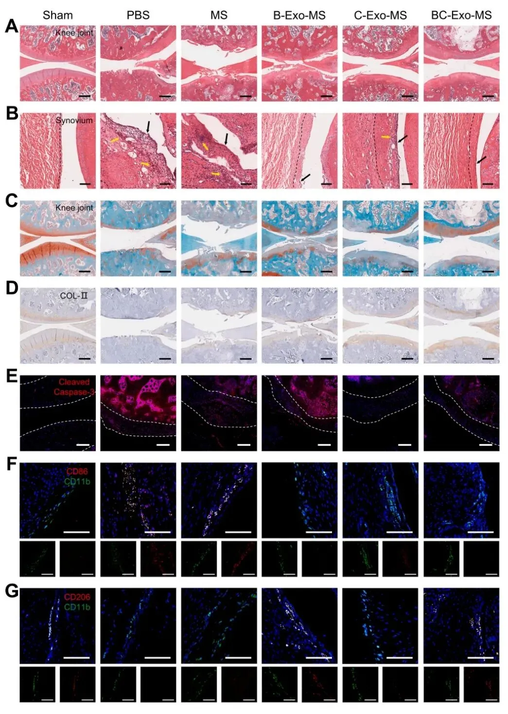 在大鼠OA模型中验证治疗效果。与单一外泌体组(B-Exo-MS, C-Exo-MS)相比,BC-Exo-MS组综合疗效最显著:更有效地提高疼痛阈值、改善步态、减少关节宽度、抑制骨赘形成、降低滑液炎症因子(TNF-α, IL-6)。组织学染色也证实BC-Exo-MS能最大程度保护软骨结构、减轻滑膜炎、促进II型胶原合成、抑制软骨细胞凋亡。