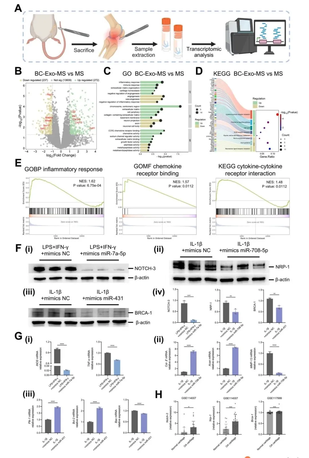对BC-Exo-MS治疗后的软骨组织进行转录组测序。发现BC-Exo调控了多个关键通路:上调ECM合成、软骨稳态相关基因(Col2a1, Cytl1),下调基质降解酶(MMPs)、血管/神经生成相关基因。通过联合分析外泌体miRNA测序数据和转录组数据,预测并验证了三条关键信号轴:B-Exo来源的miR-7a-5p/NOTCH-3(抑制炎症)、C-Exo来源的miR-708-5p/NRP-1(促进合成、抑制分解)和miR-431/BRCA-1/PLK-1(抑制凋亡)。这些靶点在人类OA软骨样本中也存在差异表达。