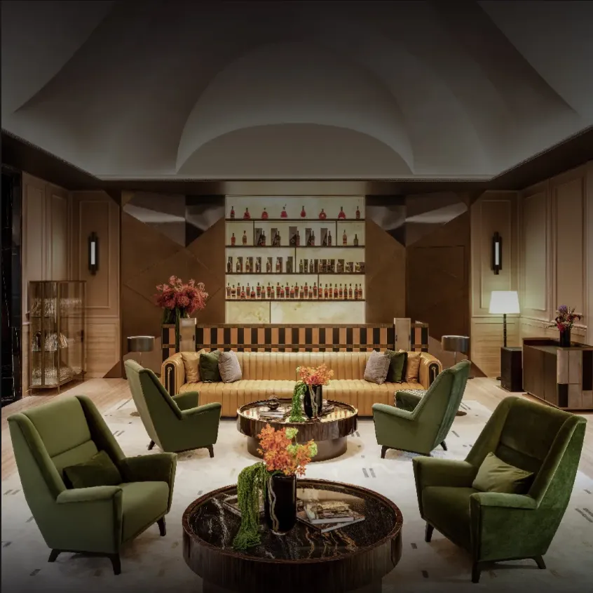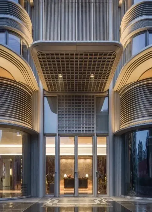 约40米宽融合铜雕与奢石的门庭,宛如大地艺术;为极致视野而淘汰6家玻璃厂打造的天幕弧屏,让立面如画卷舒展;连地下车库都成为光影交织的“艺术T台”。
