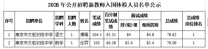 根据《南京市秦淮区教育局所属学校2026年公开招聘新教师公告》(秦事招公告〔2026〕1号)要求,在南京市秦淮区教育局的监督指导下,南京市文枢初级中学2026年公开招聘新教师面试工作已于2026年3月12结束。