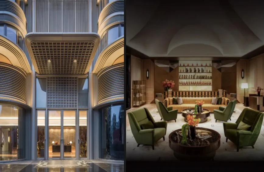 约40米宽融合铜雕与奢石的门庭,宛如大地艺术;为极致视野而淘汰6家玻璃厂打造的天幕弧屏,让立面如画卷舒展;连地下车库都成为光影交织的“艺术T台”。