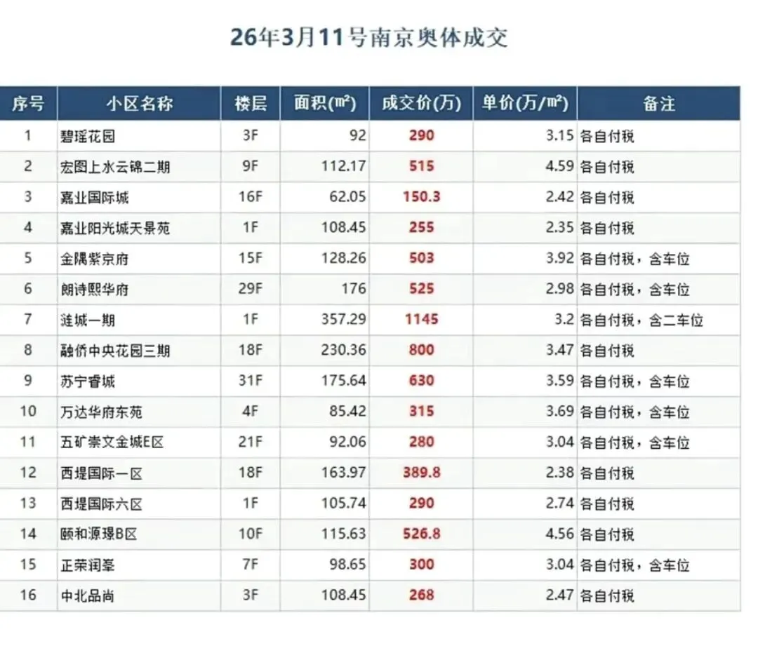 2026年3月11日,南京建邺区存量房成交数据统计