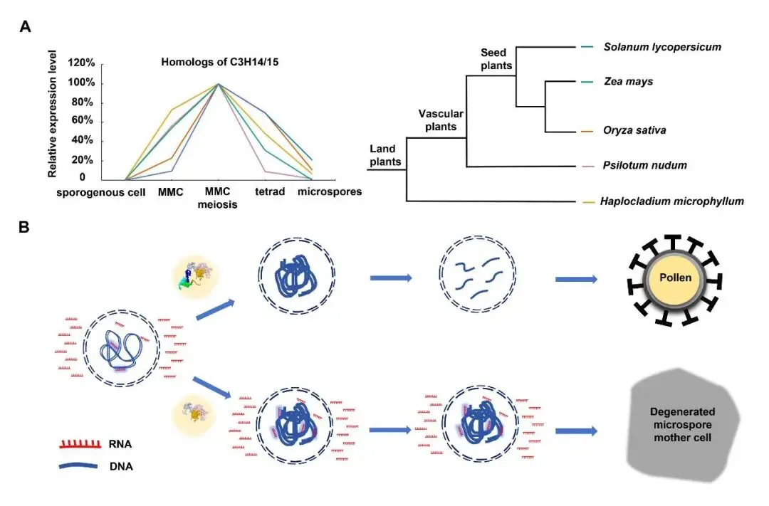 研究表明,C3H14/15在减数分裂偶线期至粗线期过渡阶段的MMC中特异性高表达,并靶向结合大量高丰度mRNA,包括编码核糖体、线粒体和质体蛋白的转录本。C3H15通过与脱帽酶DCP1互作进入Processing body(P-body),促进RNA降解。功能缺失突变体c3h14/15中,MMC内RNA过度积累,核内异常形成大量DNA-RNA杂合链(R-loop)。虽然R-loop在染色质结构与基因表达调控中具有重要作用,但其异常积累也威胁生殖细胞的基因组稳定性,尤其在DNA复制和修复过程中。c3h14/15突变体中检测到明显基因组不稳定信号,减数分裂进程阻滞于粗线期,最终引发DNA降解与细胞死亡。该研究揭示了C3H14/15作为RNA降解关键因子,在保障植物减数分裂正常进行中的核心作用,也凸显了RNA代谢在基因组稳定性调控上的关键作用。跨物种比较分析进一步表明,C3H15同源基因在单子叶植物、双子叶植物、苔藓和蕨类植物减数分裂过程中均呈现相似的表达模式,提示该基因家族在陆地植物减数分裂调控中具有古老且保守的功能。